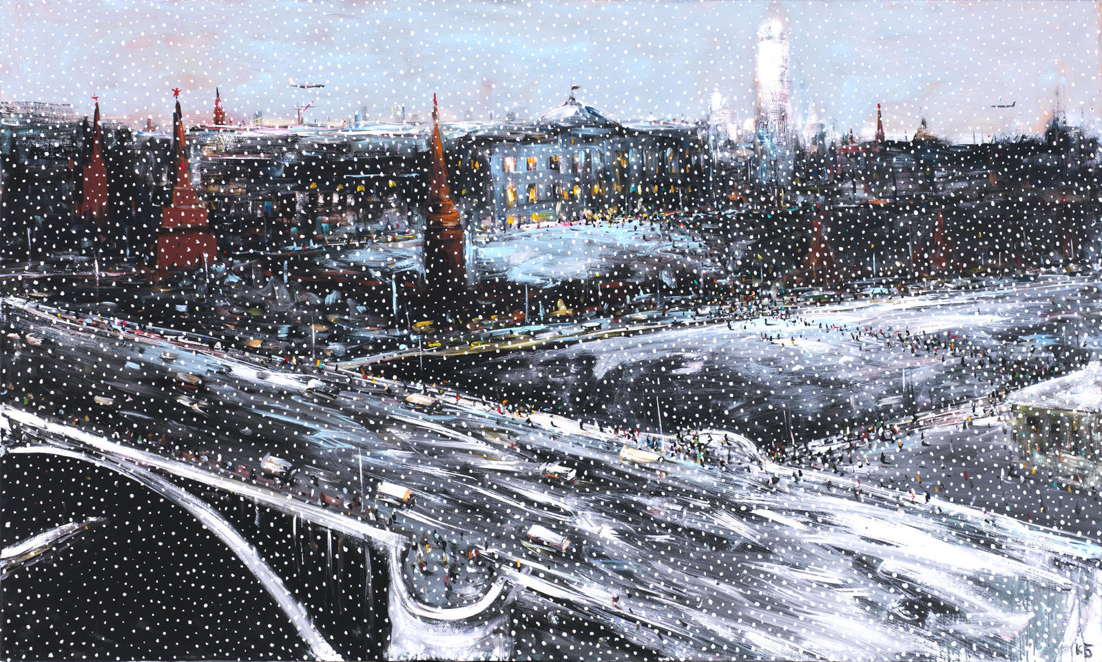 Художник, вспоминая детство, вновь сетует на настоящее: «Раньше в Москве стояло две-три гигантских елки: у Большого театра, в “Детском мире” на Лубянке, в Кремле — тоже внутри. Сейчас же... перед каждым торгово-развлекательным центром. Раньше елка была диковиной, сейчас же она превратилась в сезонную зазывалочку новогодней распродажи. Праздники кончились, начались шопинги». В представленной картине Батынков возвращает настроение новогодней сказки, которое для него так важно: ночной пейзаж усыпан маленькими точечками снежинок. Снегопад вообще создает ощущение уюта, особенно, когда наблюдаешь его из окна теплой квартиры. По мосту едут машины, идут пешеходы, в Большом Кремлевском дворце светятся окна, колокольня Ивана Великого размыта как в тумане. Сам по себе пейзаж импрессионистичен и немного условен, хотя, в общем, архитектурная композиция передана точно, а ведь Батынков писал по памяти.