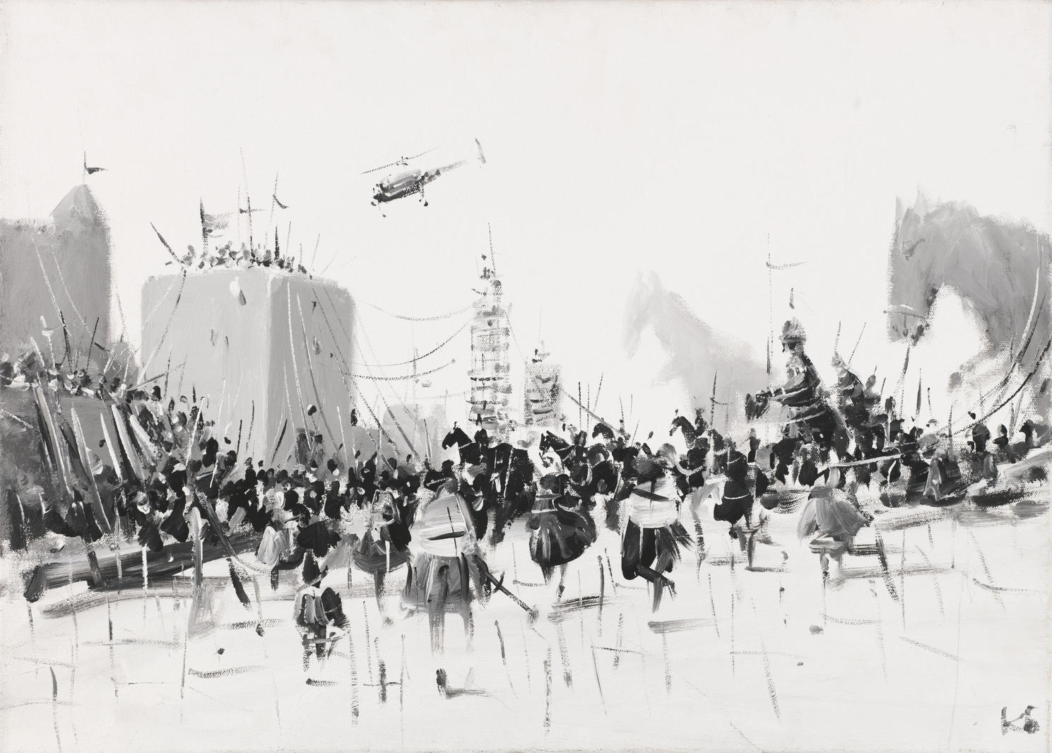 Работа Константина Батынкова из серии «Лошади» была написана в характерной для автора манере — размашистыми мазками с вкраплениями динамичных черных линий и точек — в 2007 году. Ее монохром соответствует колористическому периоду того времени, поскольку до 2010-х годов художник писал картины исключительно в черно-белой гамме. В этом произведении разворачивается драматический сюжет, герои которого мчатся по площади. От чего они бегут — неизвестно, но дорогу им преграждают всадники на гигантских лошадях. Силуэт огромного коня, появившийся в правой части картины, выдвигается наперерез бегущим. Что это может быть? Всадники Апокалипсиса? Возникает ощущение паники и надвигающейся катастрофы. Нагнетающую обстановку усиливает летящий над всем этим вертолет — излюбленный символ в творчестве Константина Батынкова. Интерес к летающим аппаратам сформировался у него еще в раннем детстве, когда он посещал кружки авиа- и судомоделирования. Также, особое влияние на него оказал отец, который был военно-морским летчиком.