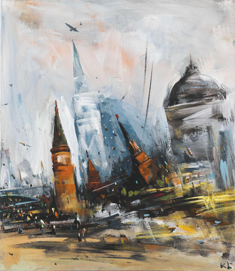 Почему «Кремль»? Наверное, время пришло. Все остальное я уже нарисовал, и не раз. Я заметил, что за сорок лет, что я рисую, при этом живя в Москве, я ни разу не рисовал Кремль. За все это время он мелькнул на моих работах максимум пару раз. Я даже помню эти работы. Я как-то интуитивно этого избегал, не отдавая себе отчета. В чем причина, не знаю. Конечно, странно, скажем, живя в Париже и рисуя виды этого города, ни разу не изобразить Эйфелевой башни. Но когда я все ж таки попробовал нарисовать Кремль, то понял, что сделать это не просто. Кремль стоит на возвышенности у реки, перспектива «съедается» мостами. Со стороны «Манежа» он выглядит довольно непрезентабельно с поздними пристройками. Да, есть парадный фасад с Москва-реки, с довольно низкой каменной стеной. Оказалось трудно его нарисовать, трудно найти точку, интересный ракурс.