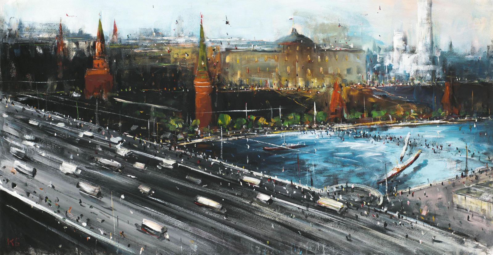 Почему «Кремль»? Наверное, время пришло. Все остальное я уже нарисовал, и не раз. Я заметил, что за сорок лет, что я рисую, при этом живя в Москве, я ни разу не рисовал Кремль. За все это время он мелькнул на моих работах максимум пару раз. Я даже помню эти работы. Я как-то интуитивно этого избегал, не отдавая себе отчета. В чем причина, не знаю. Конечно, странно, скажем, живя в Париже и рисуя виды этого города, ни разу не изобразить Эйфелевой башни. Но когда я все ж таки попробовал нарисовать Кремль, то понял, что сделать это не просто. Кремль стоит на возвышенности у реки, перспектива «съедается» мостами. Со стороны «Манежа» он выглядит довольно непрезентабельно с поздними пристройками. Да, есть парадный фасад с Москва-реки, с довольно низкой каменной стеной. Оказалось трудно его нарисовать, трудно найти точку, интересный ракурс.