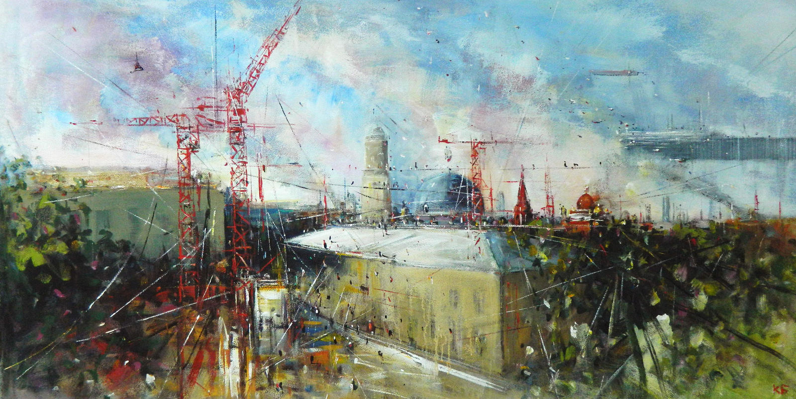 Вообще, я рисую в рамках пейзажа разные состояния моей души. В данном случае, я захотел сделать что-то позитивное. Поэтому я и остановился на этой теме. Мало того, как только здесь обосновалась галерея, я сразу захотел сделать подобную серию и выставку. И написал ее в цвете. По сюжету работы отличаются. Ну, скажем, на одной стройка с красными кранами, они же везде по Москве стоят, есть работа с каруселью, с каналом, канатоходцами, например. Но это детали, не главное. Главное здесь — не пейзаж, а состояние. Пейзаж состояния. Чем я занимаюсь, наверное, всегда.
