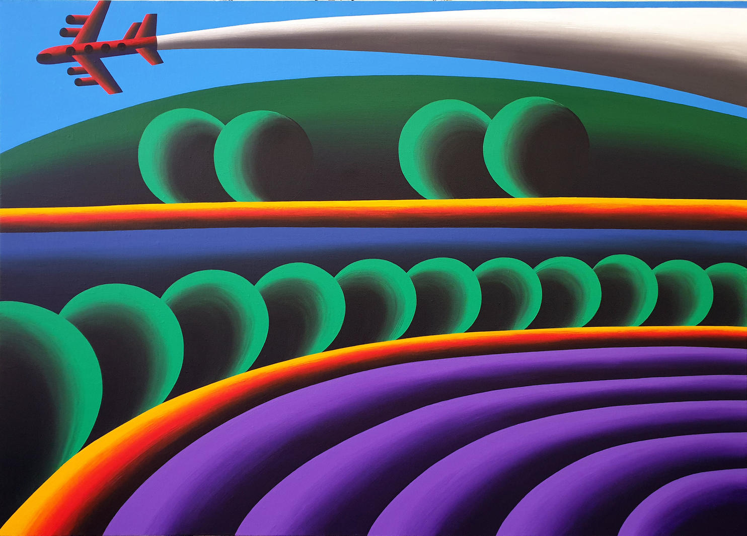 Олег Хвостов пишет идеальные ландшафты, в которых нет ничего, что могло бы помешать созерцанию натуры. Его пейзажное творчество посвящено поискам формы там, где природа берет свое. Ровные ряды пашен, дороги, холмы, шаровидные деревья — все эти композиции упорядочены ритмом и геометрией. Акрил дает объем, яркость, насыщенный тон — едкий, нахальный и витальный. Живопись отсылает к традициям фовистов и наивного искусства, напоминая об искренних и красочных пейзажах Анри Руссо и Нико Пиросмани... Идеальные ландшафты, проникнутые духом неистового примитива, передают зрителю драйв и удовольствие художника.