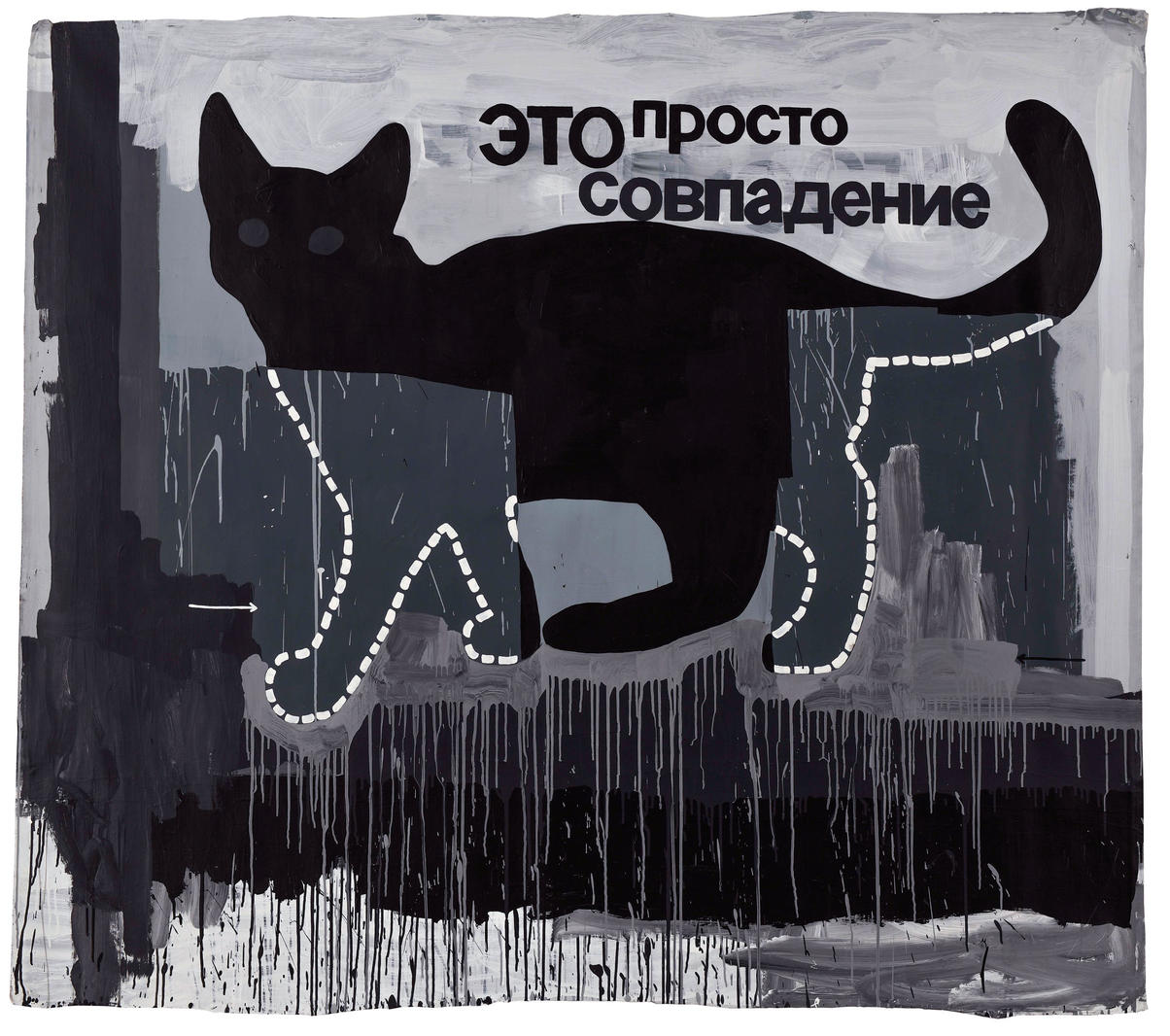 Представленная работа относится к серии «Это просто совпадение» 2019 года. Это, в определенном смысле, классическая чтаковская вещь. Здесь есть и монохромная цветовая гамма, и текст, и нарочитая небрежность красочных подтеков, и предельно лаконичное силуэтное изображение. «Это просто совпадение», что работа создана на холсте — он мимикрирует под поверхность уличной или подъездной стены, богатой на собственные истории и закрашенной уже не раз. Образ черного кота обладает схожими коннотациями во многих мировых культурах и встречается в произведениях Чтака далеко не впервые; это центральный образ серии. Главную роль в работе играет, конечно, текст — основа художественного мира Чтака, обусловленная его увлечением литературой. Примечательно, что в работах 2000-х художник был сосредоточен на «изобразительности» текста, и потому использовал сначала английские слова, а затем обратился к славянским языкам, строящим свою письменность на латинице. Его интересовала визуальная «красота» слова. За последние десять лет письмо утратило для него то в некотором смысле сакральное и одновременно эстетически обусловленное значение, и потому художник все чаще строит свое высказывание на русском языке. В представленной работе Чтак использует текст как способ дать волю первоначальной задаче произведения искусства: побудить зрителя к определенной интеллектуальной и эмоциональной активности. «Это просто совпадение» — первая мысль, которая приходит в голову, когда через дорогу перебегает черный кот. Совпадение ли то, что частично кот изображен пунктиром, или то, что этот кот вообще изображен на картине? Можно ли вообще считать кота черным, если он состоит в том числе из серых фрагментов и белых полос? «Возможно, да, а, возможно, нет, не знаю» — таким мог бы быть ответ Валерия Чтака на наши вопросы. V