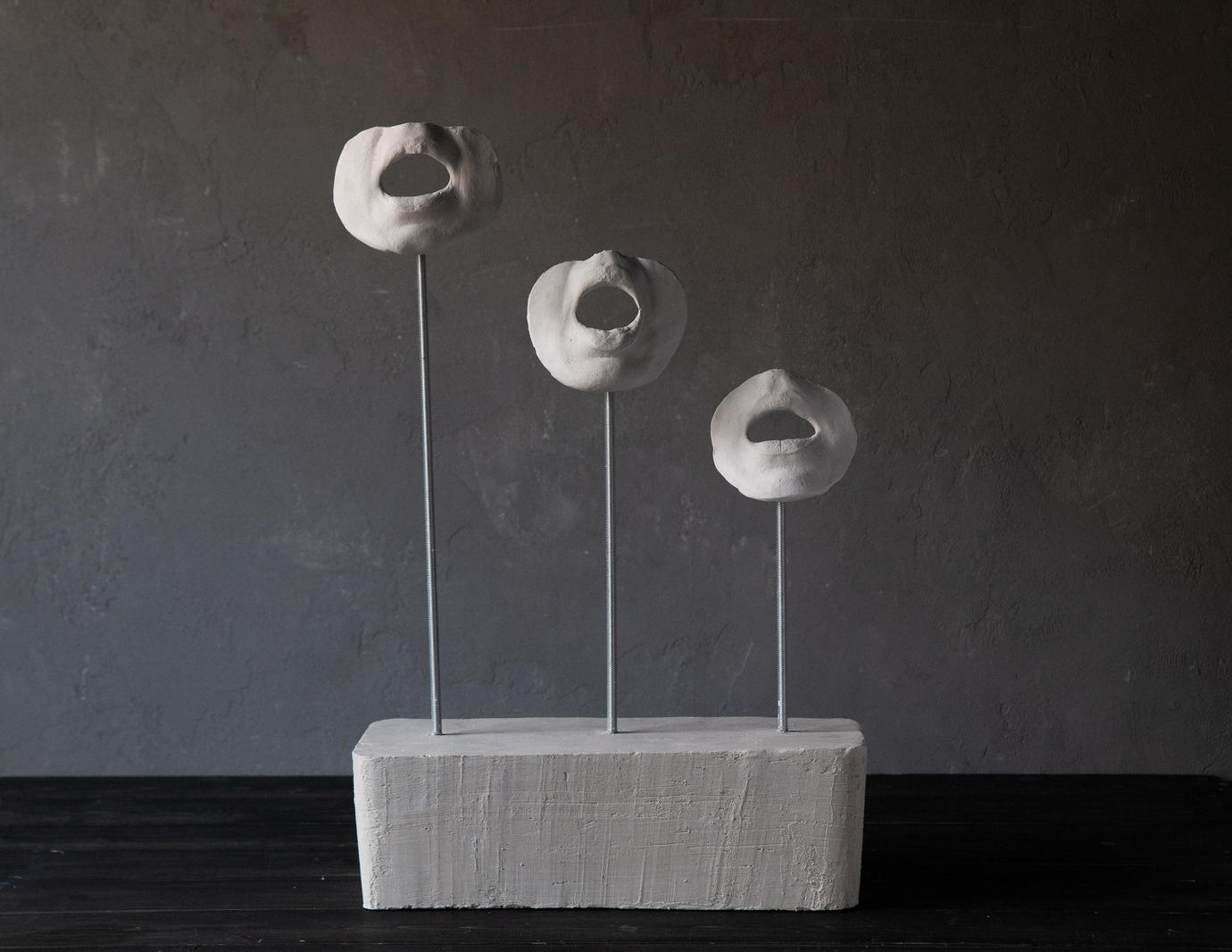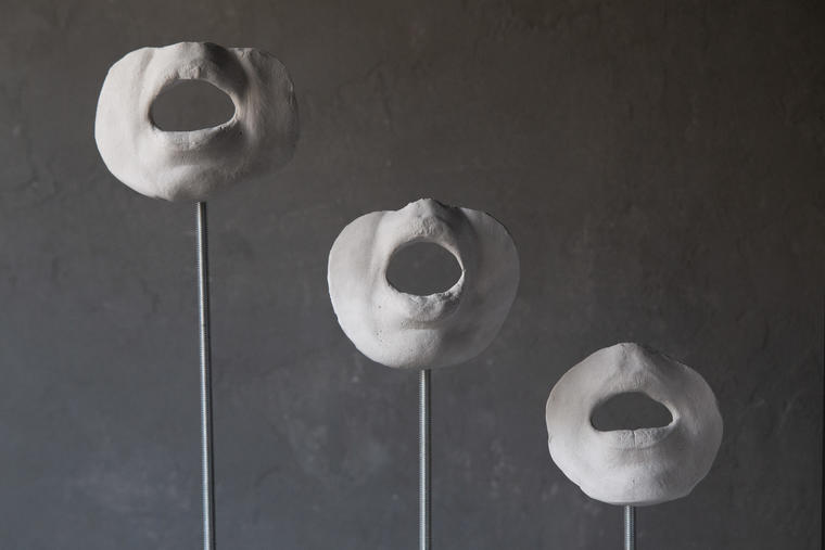 Для скульптуры я использовала слепки незнакомых друг с другом людей, создав таким образом их случайную встречу. Проросшие в бетоне, хрупкие гипсовые рты чуть дрожат на железных прутьях, словно распевающийся хор. Трио анонимных индивидов выстроились в ряд, автоматически создавая иерархию в восприятии зрителя. В чем природа иерархии как структуры? Не является ли она, порой, лишь следствием случайного расположения в ряду?