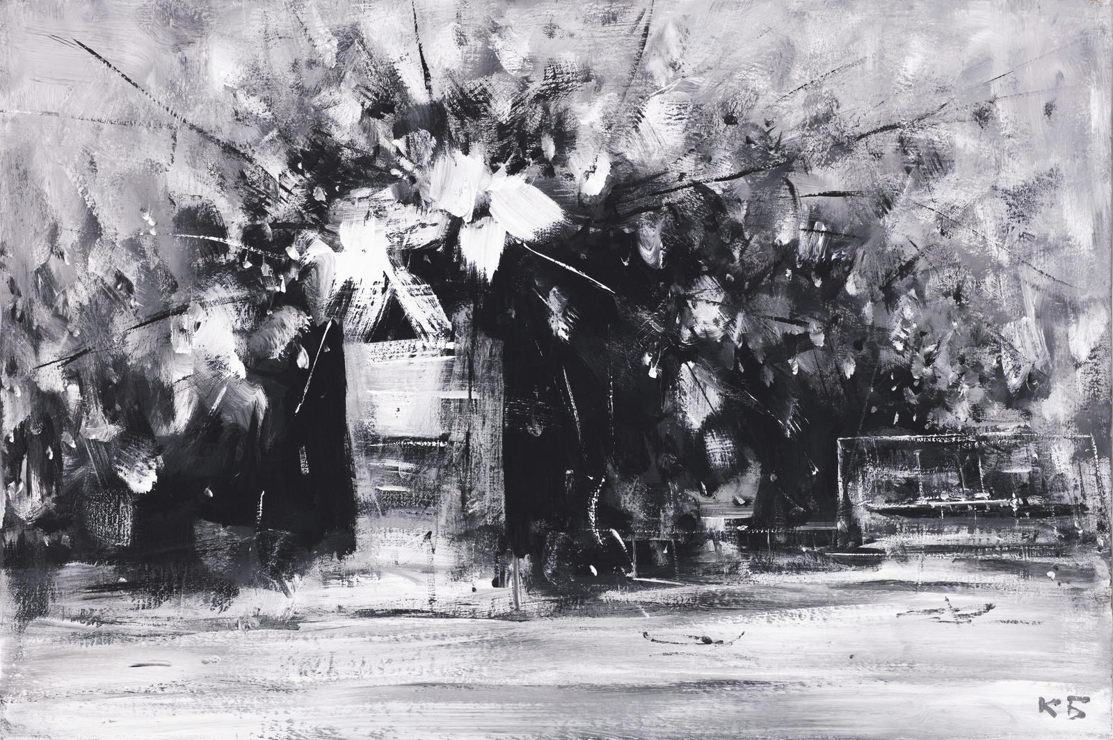 В произведении «Цветочки» авторский взгляд сфокусирован на вазе с цветами, написанными на холсте в экспрессивной манере, лишенной при этом цвета как такового, в угоду хрестоматийной для Батынкова чёрно-белой тональной живописи. По словам автора, «мир меняется сумасшедшими темпами. Такой глобальный экшн кругом. Иногда действительно хочется «тихой жизни», просто сесть и смотреть в окно и на подоконник, как солнечный луч перемещается по каким-то баночкам, горшочкам… У меня на окне в мастерской стоит баночки с кисточками. Они всегда перемещаются по окну, солнце в разное время суток их по-разному освещает и возникает ощущение, что эти предметы двигаются. Я не натуралист, но мне это интересно. Я не выдумываю эти предметы, смотрю по сторонам и рисую почти с натуры. Однажды захотелось нарисовать цветы, которые не стоят у меня на подоконнике, а нарисовать по памяти. Просто так безотчетно захотелось. Такое с художниками случается. Художник редко об этом задумывается. Он замечает какие-нибудь вещи и пытается их зафиксировать, а что из этого получится, не знает».