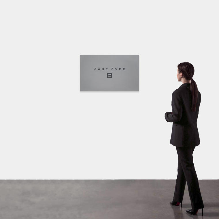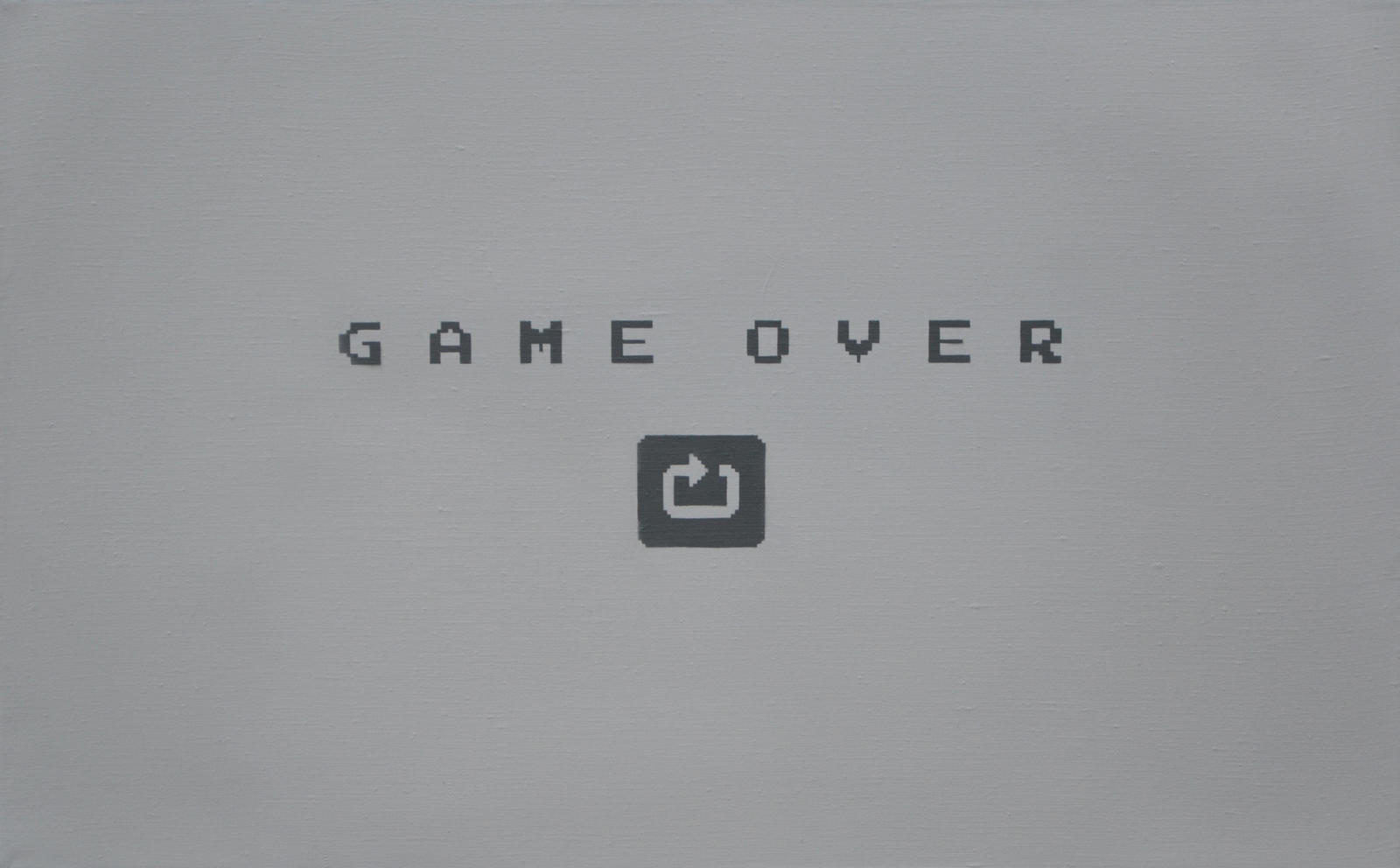 «"Game over” — холст по мотивам уличной работы, созданной нами в Коломне в 2017 году. Это была принудительная коллаборация одновременно и последовательно с художником Владимиром Абихом, коломенскими детьми и коммунальными службами. Сначала Владимир создал свою работу “Offline” с сюжетом из компьютерной игры, которая случается при отсутствии интернета. Следом стену разрисовали коломенские дети, а коммунальные службы закрасили все это в серый цвет. И затем Фрукты Врукты подытожили это финальной плашкой из той же игры. С одной стороны игре конец, но меню предусматривает кнопку, позволяющую начать новый круг».