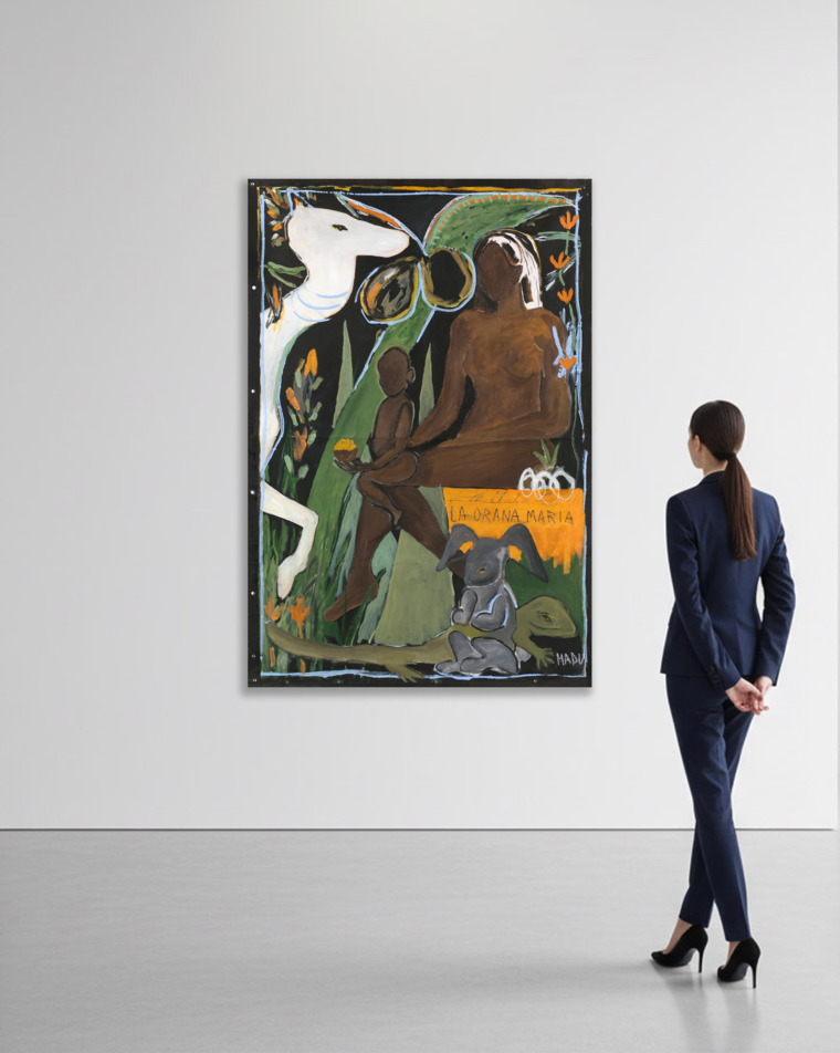 «LA orana MA ria 2 — это мои размышления на тему передачи опыта, учительства, заботливого наставничества. Тибетцы переводят лама вот так: «ла» означает непревзойденный или наивысший, в то время как «ма» значит мать. Ламы напоминают матерей, заботливо поддерживающих своих учеников на пути духовного развития. Изображённая на картине женщина, мать, поддерживает на коленях дитя, подпирая его и поддерживая в нем его внутренний стержень. Мадонна с младенцем в моем понимании и интерпретации».