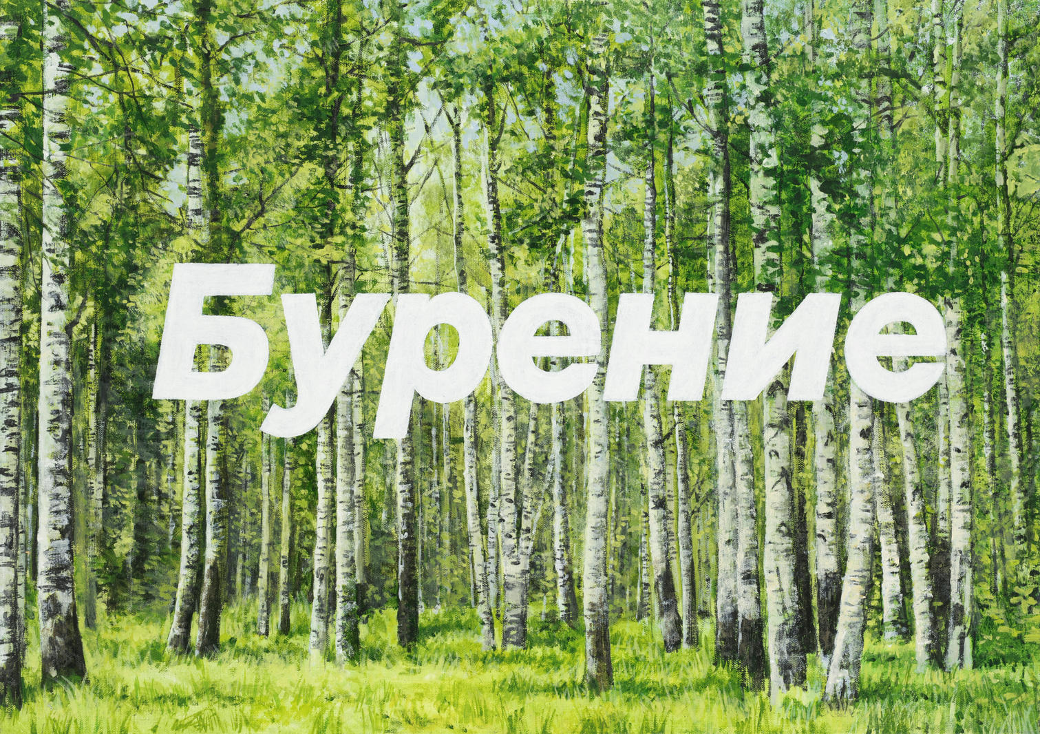 «На холстах этой серии написаны маслом пейзажи с фотообоев, поверх размещены тексты уличной рекламы, выполненные шрифтом из сторис. В регионах России часто можно увидеть на остановках, в витринах магазинов, на жилых домах — баннеры, фотообои, плакаты с пейзажами девственной природы. В маленьких городах и деревнях у людей дома часто висят такие фотообои или плакаты из виниловой пленки. На них изображены водопады, горы, лес, луга. Когда отъезжаешь от Санкт-Петербурга или Москвы на 50 километров в область, это все начинает сильно бросаться в глаза.