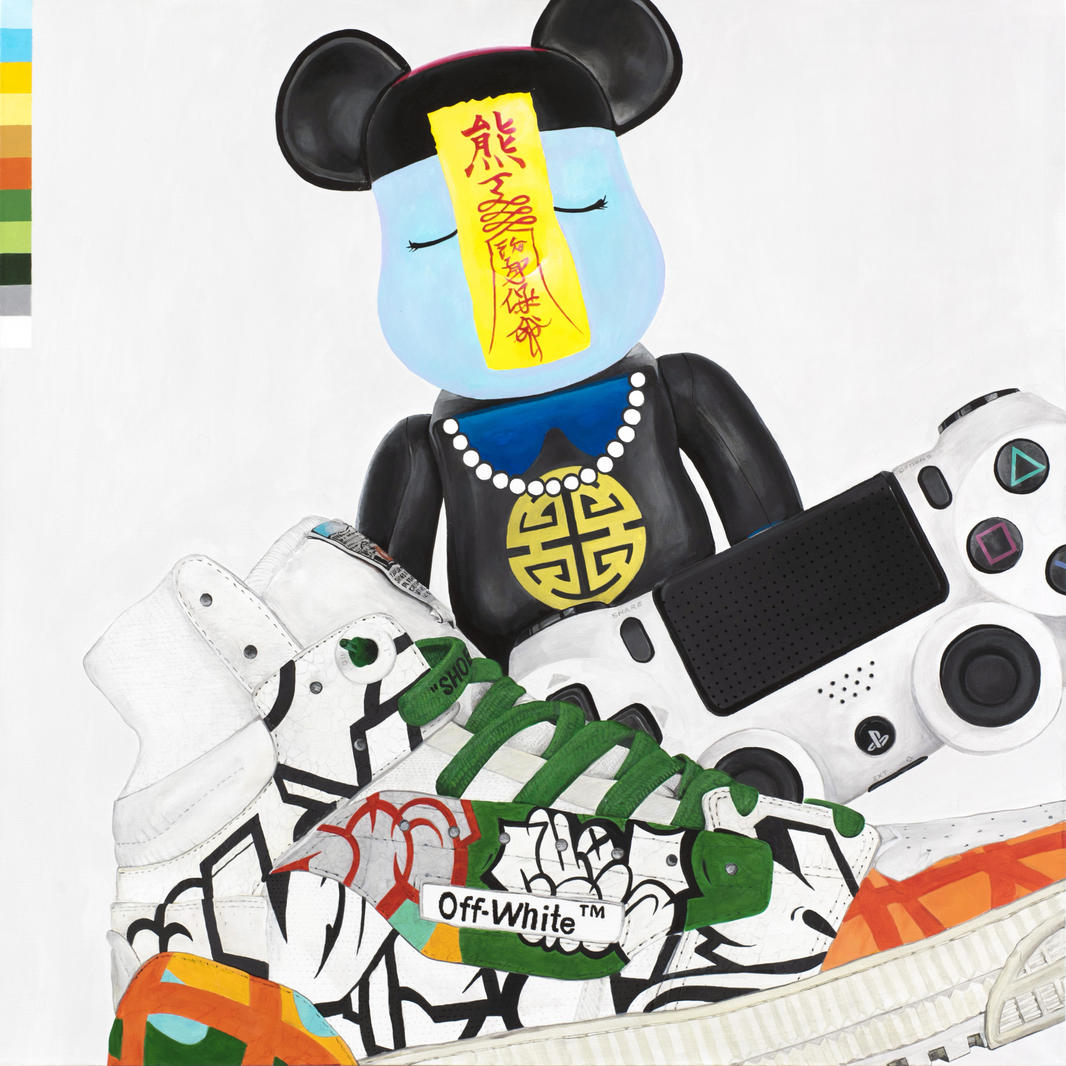 Мастерски переданная фактура предметов: лоснящаяся гладкая поверхность статуэтки, матовые кнопки геймпада, характерные трещинки красочного слоя на кроссовке — создают гиперреалистичное впечатление трехмерности объектов, будто выставленных в витрине люксового бутика. К ним так и хочется прикоснуться. V