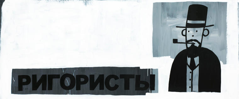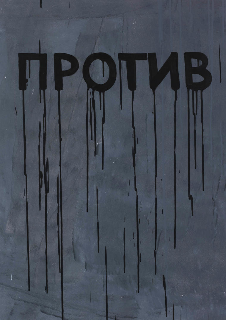Представленный на торгах триптих «Ригористы против латитундариев» — это, в определенном смысле, классическая «чтаковская» вещь. Здесь есть и монохромная цветовая гамма, и текст, и нарочитая небрежность красочных подтеков, и предельно лаконичное силуэтное изображение. Холст успешно мимикрирует под поверхность уличной или подъездной стены, богатой на собственные истории и закрашенной уже не раз. Словно выхваченные из трех разных надписей, на что указывают отличные друг от друга шрифты и начертания букв, слова образуют новое, цельное высказывание, хоть и на первый взгляд лишенное смысла.