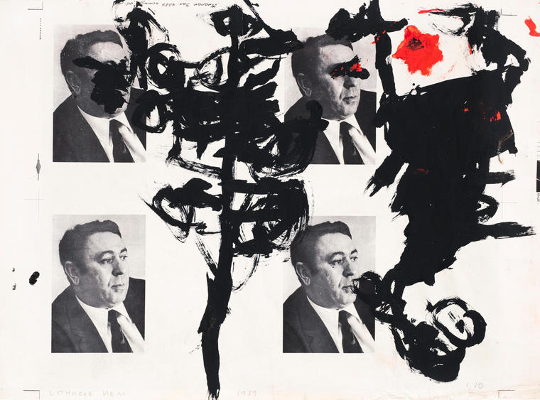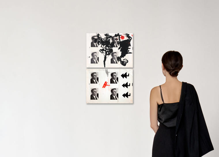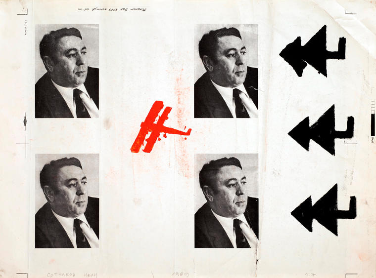 В период плотного общения с «Новыми художниками» у Сотникова появляются свои особенные символы, персонажи и приемы: машинки, снежинки, елки, самолеты, зачастую нарисованные по трафарету и кочующие из одной работы в другую. Выбранный им визуальный ряд отражает художественную программу «Новых», ниспровергающую академизм и ориентирующуюся на народное искусство с его солярными знаками и пиктограммами. В представленной работе характерная для автора иконография соединяется с социально-историческим контекстом времени: 1989 год — «перестройка» идет полным ходом, и фоном для своего произведения Сотников выбирает типографскую заготовку с портретом «пиджачника». «Пиджачник» — неологизм, введенный в употребление художником и обозначающий партийного работника высокого ранга или, шире, — любого приверженца социалистической идеологии. В репродукциях снимка узнаются черты лица азербайджанского поэта Наби Хазри — певца труда, братства и дружбы народов СССР, чьи соцреалистические стихи не раз удостаивались государственных премий и наград. Используя методы перекомпозиции и обнуления, взятые «Новыми» за основу своих художественных высказываний, Сотников наносит поверх заготовки елочки на ножках, самолетик размером со спичечный коробок, экспрессивные, напоминающие растительный узор, линии, и тем самым нивелирует весь пафос и официоз идеологии, партии и ее служащих. V