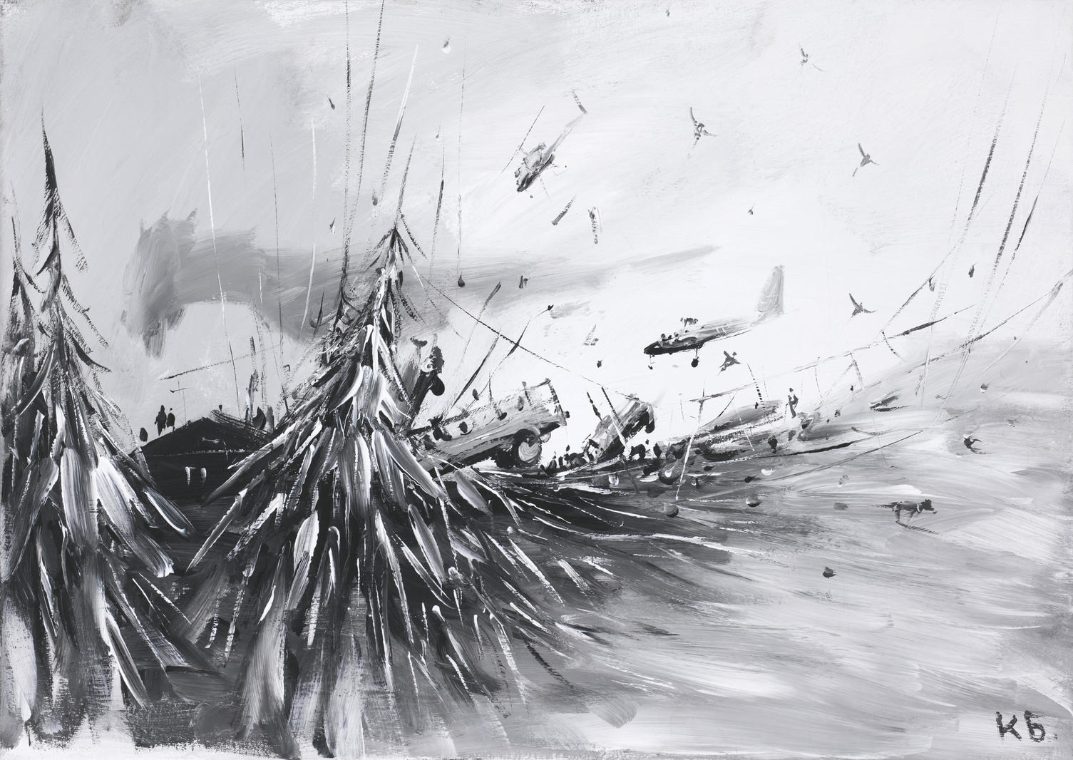 Излюбленным жанром Константина Батынкова можно считать пейзаж, на фоне которого и разворачивается все вышеописанное. Нагромождая образы, намеренно взятые из абсолютно разных пространств, художник создает работу «Две ёлки» — пейзаж, лишенный какой-либо географической конкретики, представляющий собой нечто среднее между городским и деревенским ландшафтом. Скопление общественного транспорта и вертолетов перетекает в композицию с еловым лесом и деревянной избой. Ощущение сюрреальности усиливается стремительными, экспрессивными штрихами и насыщенными оттенками черного, благодаря которым композиционный центр работы смещается в сторону, а все образы словно находятся в непрерывном к нему движении и, кажется, вот-вот свернутся в одну черную точку, а вслед за этим мгновенно исчезнут подобно внезапно оборвавшемуся сну. Для Константина Батынкова не существует статичных жанров: его холсты всегда пульсируют, дышат. От изобилия мелких штрихов, деталей создается впечатление стремительно летящей фантазии художника. V