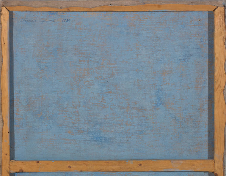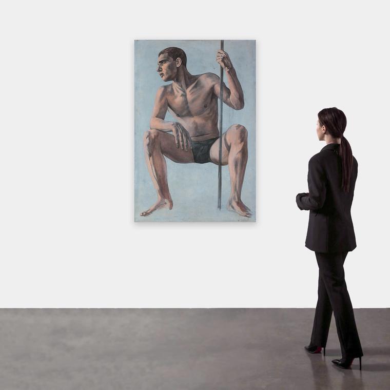 Представленная работа «Без названия» является характерным образцом творчества Гурьянова 1990-х годов и связана с одним из самых знаменитых его произведений — монументальным полотном «Гребцы» (1998–2013). В основу сюжета «Гребцов» лег репортажный снимок, сделанный в Германии в 1930-х годах, а в качестве моделей здесь выступили художник и поэт Станислав Макаров, знакомый Гурьянова по имени Сергей, занимавшийся греблей, и сам художник, не единожды повторивший образы всех моделей для создания многофигурной композиции. Существует три варианта картины (один из них был продан на Sotheby’s в 2016 и 2019 годах, два находятся в частных коллекциях), и еще два остались незавершенным на момент смерти автора, известного своим перфекционизмом и длительной работой над каждой картиной. Гурьяновым было исполнено множество подготовительных эскизов к картине, ставших самостоятельными произведениями. Данный лот является изображением Станислава Макарова. Схожий образ можно увидеть в «Гребцах» справа, в третьем ряду персонажей, а также в композиции «Гребец Станислав».
