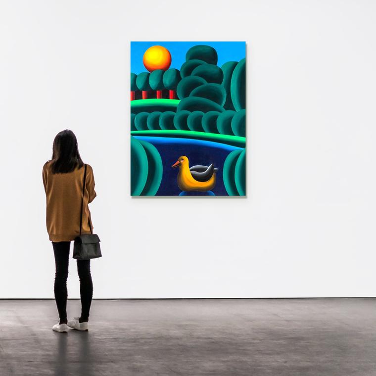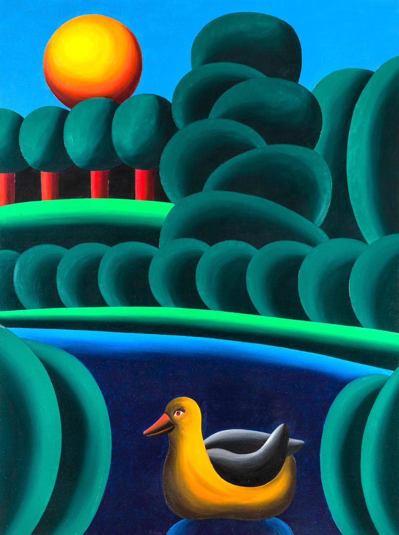 В представленной работе «Утка» все застыло, в этой идеальной вселенной ничего не происходит. Художник не оставляет возможности вторжения случая или события. Оранжево-желтое солнце зависло на небе, идеально-стеклянная гладь озера неподвижна, округлые кроны деревьев не колышутся на ветру — все закономерно, складно и спокойно. Даже утка, редко встречающийся в работах Хвостова живой образ, здесь обладает непропорционально большими размерами, тем самым превращаясь в декорацию. Это идеальный мир, в котором гладкие яркие формы в равномерном холодном освещении словно сделаны из синтетического материала, а сформированные из них пространства существуют в безвременье как некие условные модели мира.