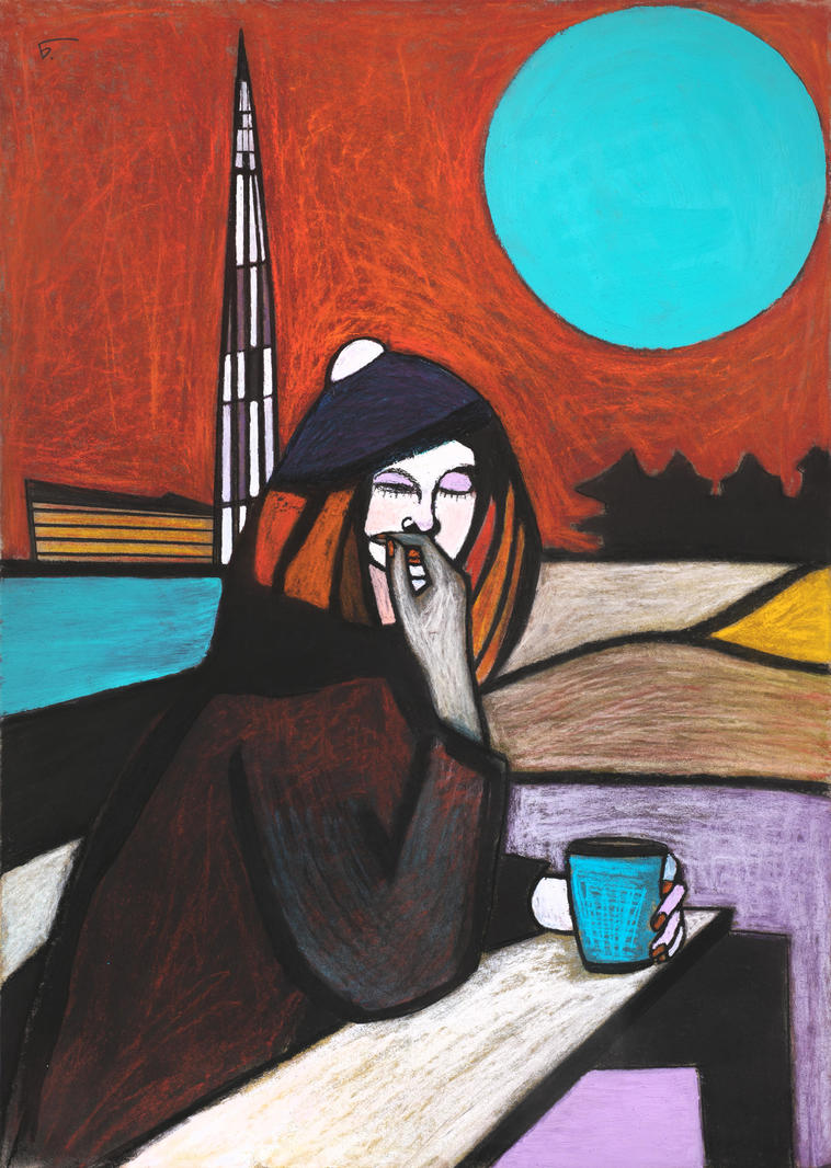 Работа продолжает серию «Новый Петербург», которая посвящена Лахта Центру и исследованию удаленного от исторического центра Петербурга района. Это место интересует меня не только как новая архитектурная доминанта, но и как среда, где встречаются разные исторические пласты. Я помещаю одну из многих героинь своих жанровых картин в среду новой архитектуры, где сталкивается старое и новое.