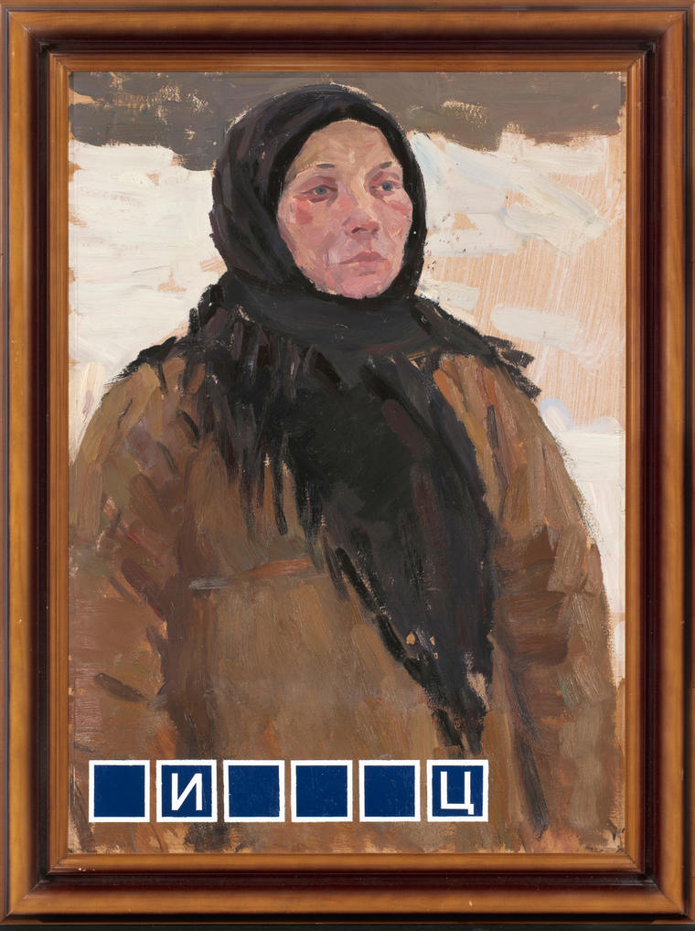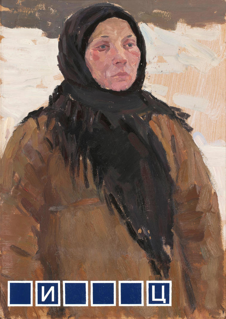 Эта работа выполнена на холсте советского художника Емельяна Кулебякина (1925-1967). Мне посчастливилось купить портрет крестьянки по объявлению, и он какое-то время висел у меня в мастерской. Меня захватил опустошенный взгляд женщины, та особая русская смиренность и безысходность вместе с жизненным опытом, наполненным горем. Когда начались известные события, многие впали в подобное расположение духа. В воздухе витала недосказанность, а голове вертелось слово из шести букв.