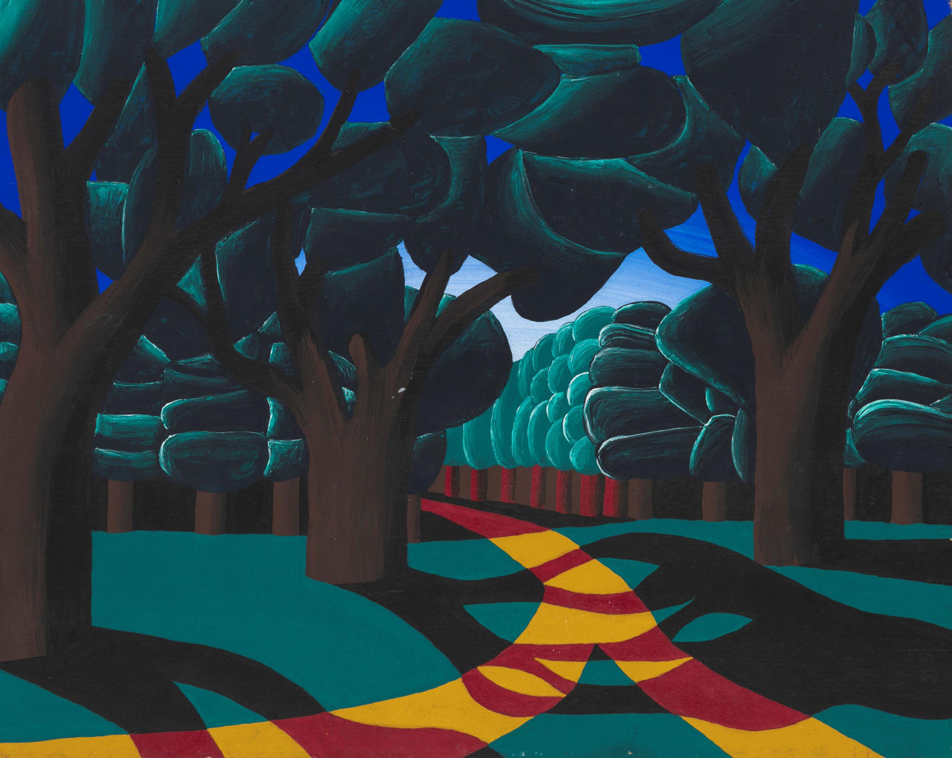 В представленной работе все застыло: не найти свободного места, отсутствует воздух, нет ни единого живого существа. Художник изображает идеальные округлые кроны деревьев, вдоль которых идет тропинка. И даже тени, отбрасываемые ветвями, недвижимы. Как известно, в идеальной вселенной Хвостова ничего не происходит, художник не оставляет возможности вторжения случая, события. В работе все закономерно, складно и спокойно.