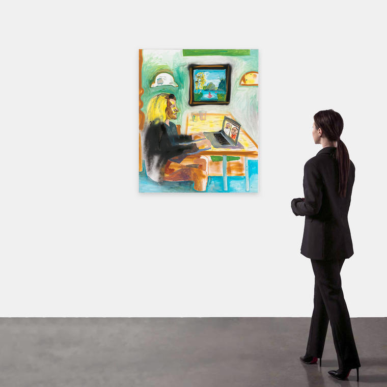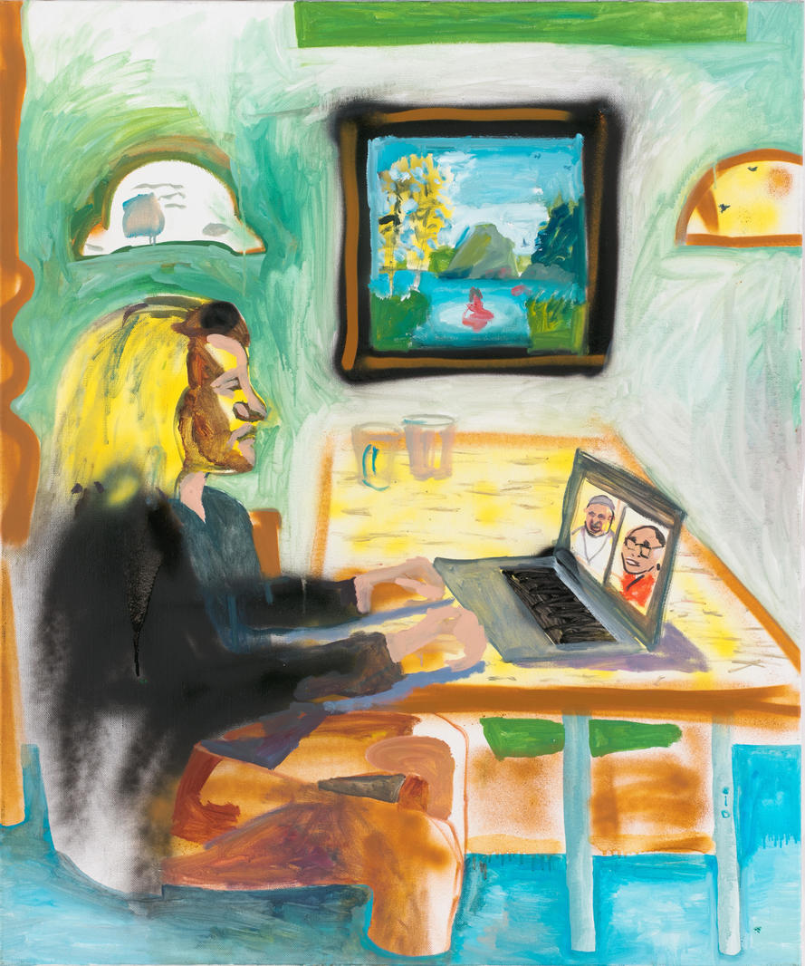 Холст из проекта «коуч-живопись», над которым я работаю вместе с Виталием Черепановым. Мы размышляем о мечтах и образах счастья, навязанных культурой. Они конструируют различные нарративы: от непосредственного обладания какими-то материальным благами до получения доступа к исключительно духовным и интеллектуальным практикам. В этом смысле, в период пандемии и зум-реальности притягательным может быть зум с папой римским и Далай Ламой. В тот же момент мысль, высказанная через изображение, есть ни что иное как визуализация, а это уже полпути к осуществлению задуманного, как уверяют коучи. Это автопортрет, в котором Анна изобразила себя в характерной позе за столом — так изображен академик Павлов у Нестерова. Поза напряженная, но под столом ноги героини погружены в воду почти до колена, как во вьетнамском релакс-кафе. Но откуда взялась вода? Не просочилась ли она из картины «Христофор несет младенца» на заднем плане? Или быть может Анна и Христофор идут через один брод?