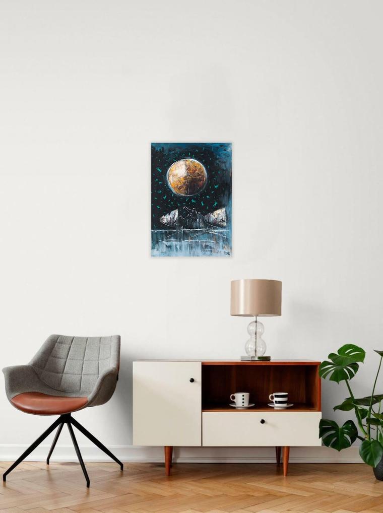 Картину из серии «Космос наш» Константин Батынков пишет в свойственной ему манере — размашистыми мазками с вкраплениями динамичных черных линий и точек. На работе изображена сфера — излюбленный образ в творчестве автора. Исходя из названия и тематики, она может напоминать спутник или иное космическое тело. Интерес к небу сформировался у Батынкова еще в раннем детстве, когда он посещал кружки авиа- и судомоделирования. Особое влияние на него оказал отец, который был военно-морским летчиком. Примечательно, что даже после окончания школы, Батынков поступил в Московский институт инженеров гражданской авиации, после которого работал авиационным инструктором-инженером. Несмотря на увлечения техническими науками, художник начал писать и рисовать с первого класса, после чего уже никогда не останавливался. Юный Батынков посещал художественные школы и осуществлял долгий поиск живописной манеры. Эта картина выдержана в сложной цветовой гамме, что отличает ее от более ранних работ автора, который до 2010-х годов создавал произведения, используя черно-белый колорит.