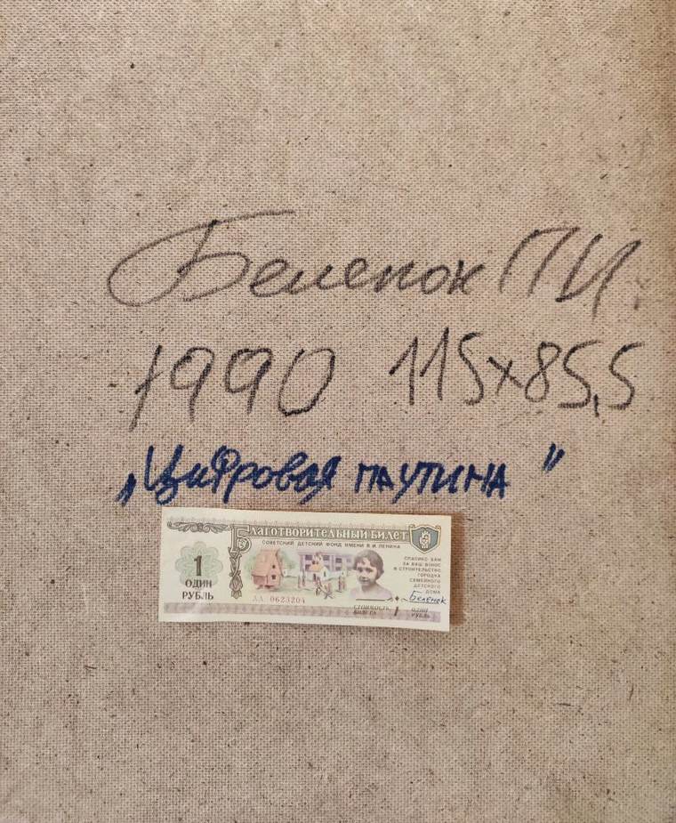 На оборотную сторону работы вклеен благотворительный билет. Художник часто покупал их на деньги, которые приносили редкие продажи произведений, и дарил жене — для нее, как для воспитанницы детского дома, такие вещи имели особое значение. На оборотах работ билеты размещались Беленком «на удачу» и содержали еще и элементы перформативной практики: художник нередко подписывал их будущим обладателям так — «добрые мысли, добрые слова, добрые дела».