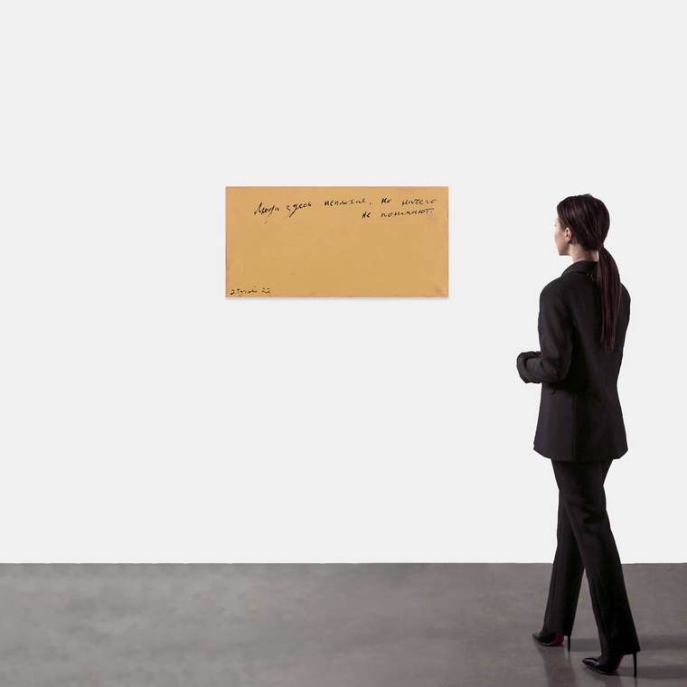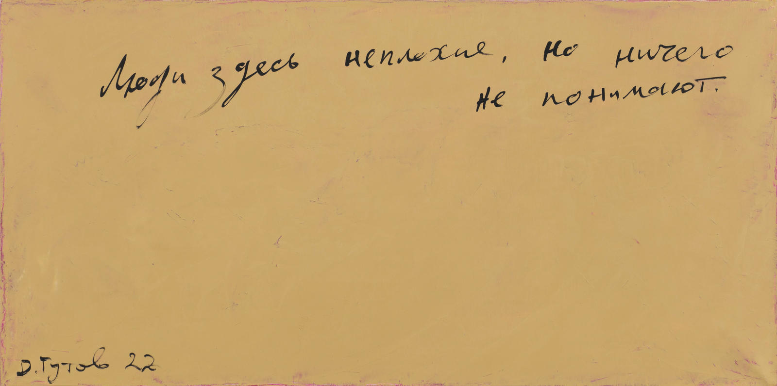 «Текст в работе — цитата из писем Ван Гога своему брату Тео. Я люблю эти письма. Сама фраза очень гуманная, говорит о хорошем отношении к людям. Но все это тянется из какой-то прошлой эпохи, когда это было актуально. Сейчас бы я написал картину “Люди — подонки, хотя понимают все прекрасно”».