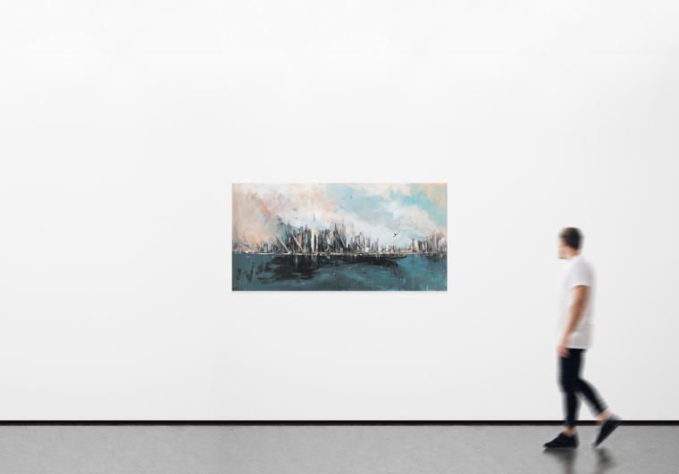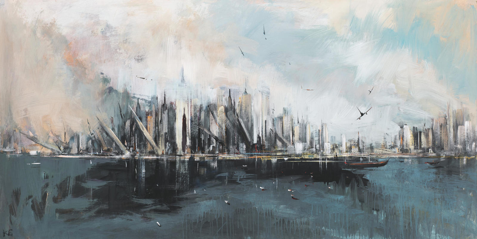 Изменяя привычному изображению горячо любимой Москвы, Константин Батынков пишет Нью-Йорк — город больших надежд и мечтаний. Художник останавливает свой взгляд на острове Манхеттен со стороны Гудзонского залива. Автор называет произведение по одноименной песне группы «Аквариум» — «Город золотой» — в тексте которой содержатся отсылки к библейским образам, а сам небесный город с золотыми воротами символизирует рай. Отличительной особенностью «рая» Батынкова стала его динамика. В картине летят самолеты, падают башни и клубится дым. Движение в сюжете подкрепляется размашистой манерой письма художника, также добавляющей динамизма.
