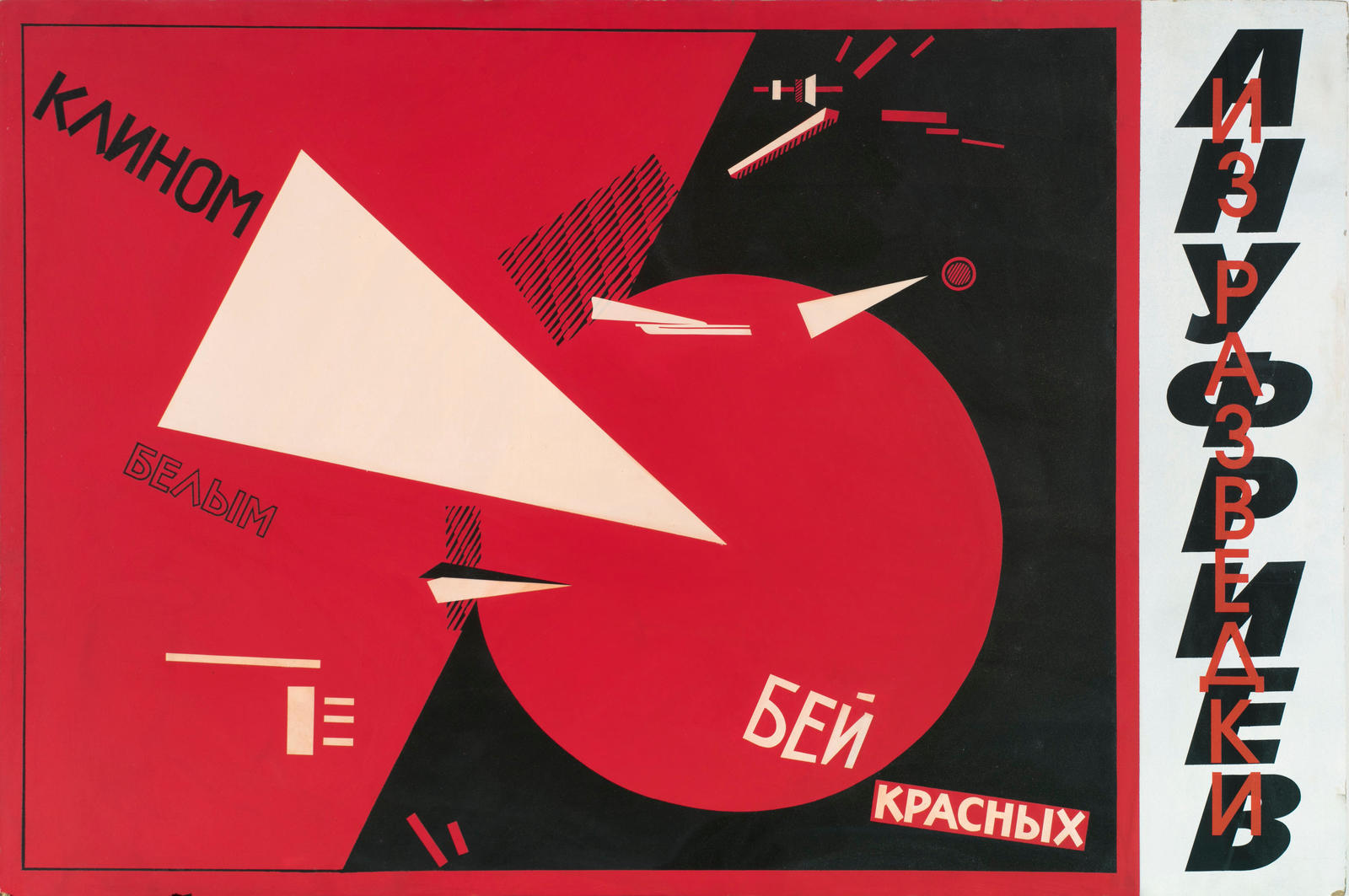 «Одна из фундаментальных работ ХХ века, “Клином красным бей белых”, ввела в современное искусство принцип политизации цвета или сверх-эксплуатации цвета. Это было отмечено рядом специалистов, в том числе Жан-Франсуа Лиотаром. Поэтому на протяжении длительного времени я делал попытки смягчить эту форму подчинения, которую разработал Лисицкий, или продолжить ее использование в искусстве, чего до этого никто не делал. Собственно говоря, призыв красным треугольником убивать белых — это специфическая вещь. Ее рассматривают только с точки зрения форм — война треугольника с кругом.
