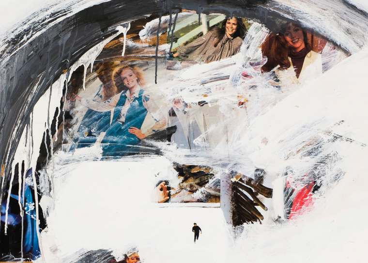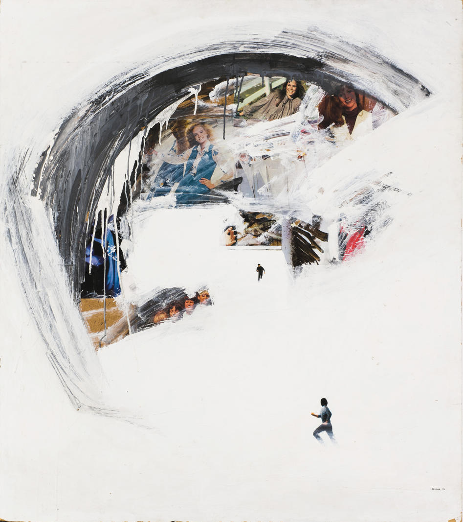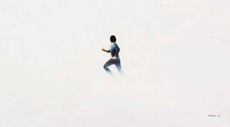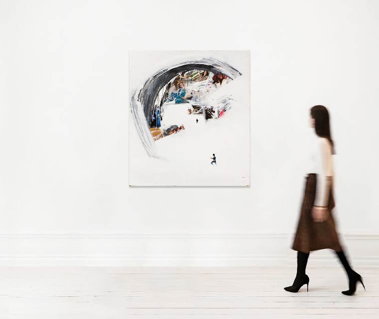 Представленная на торгах работа «Без названия» является характерным образцом творчества художника. Размещенная на белом фоне, как на занесенном снегом поле, одинокая мужская фигура оборачивается в беге. Герой смотрит на огромную серую дугу, внутри которой еще одна крохотная бегущая мужская фигура в окружении масштабных образов эффектных красавиц, словно смотрящих на нас со страниц женского журнала мод. «Панический реализм» Беленка в этом контексте приобретает скорее иронический оттенок, поскольку мужчинам, обычно убегающим в его работах от последствий или от непосредственного свершения неких катастроф, здесь угрожает лишь надвигающийся на них мир радостно улыбающихся и уверенных в себе женщин. Работа уникальна тем, что общее настроение всей композиции в целом предстает менее тревожным, нежели во многих других произведениях художника. V