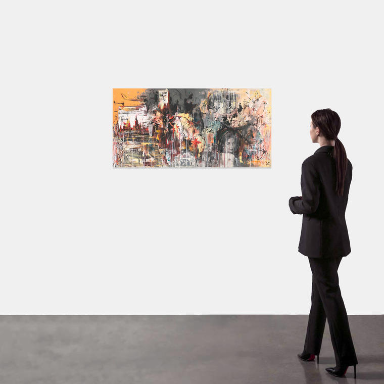 Представленная работа 2022 года выполнена в необычной для художника технике: к фирменному экспрессивному мазку Батынков добавляет коллаж из газетных новостных вырезок. В пространстве произведения словно в бессознательном потоке слились события разных эпох: здесь есть и блистательная Элизабет Тейлор на Каннском кинофестивале 1957 года, и Хрущев, держащий на руках маленькую девочку, и марширующие среди заснежья люди, и архивные снимки Махачкалы, и другие документальные кадры. Эти сюжеты располагаются на холсте в хаотичном порядке, укрытые полупрозрачными слоями акрила. Вокруг «событий» современной истории кружат силуэты людей и вертолеты — фирменные образы искусства Батынкова.
