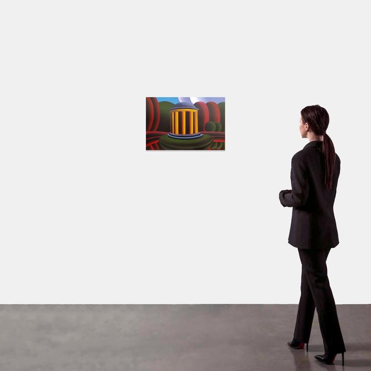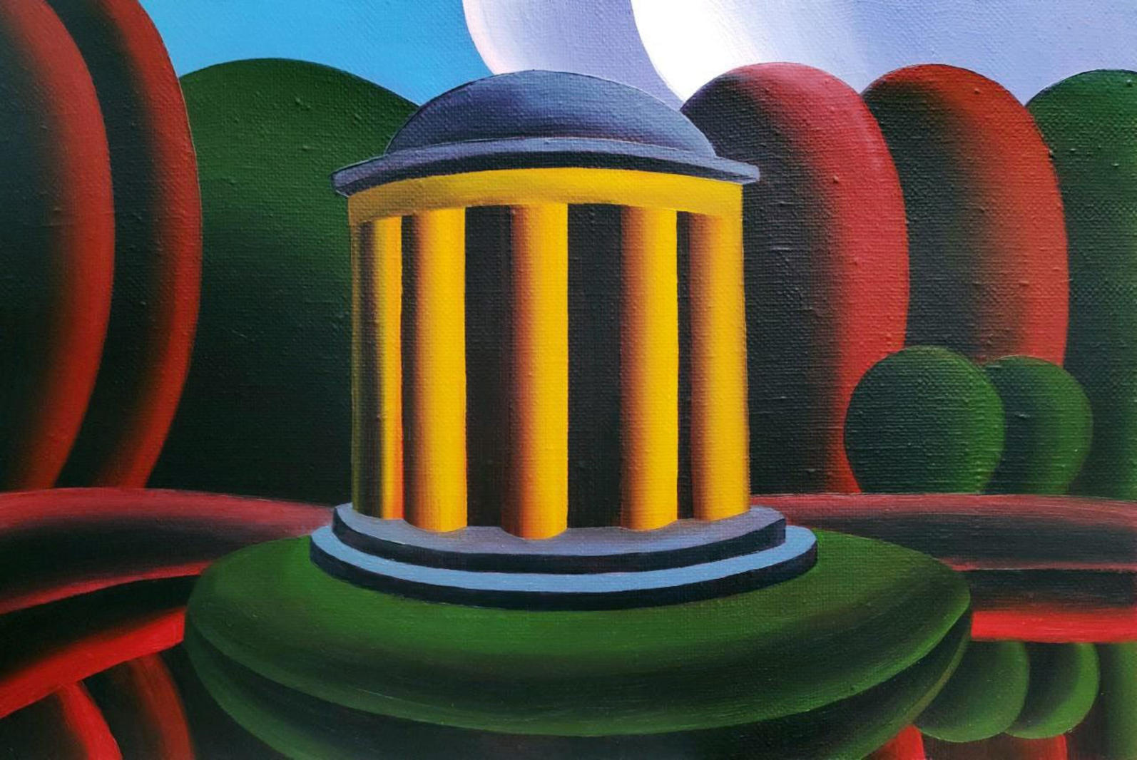 В представленной работе не найти свободного места, практически отсутствует воздух, нет ни единого живого существа. Ритмичные линии, изображающие парковый ансамбль, создают эффект равномерной пульсации, которая также подчеркивает «механистичность» техники исполнения. Этот пейзаж — продукт идеальной вселенной и, кажется, будто бы он не имеет отношения к чему-либо по-настоящему существующему на земле. При этом название работы указывает на вполне конкретное место — парк Екатерингоф в Санкт-Петербурге. Художник даже пишет знаковый для этой локации элемент — ротонду, но изменяет ее цвет с белого на желтый, тем самым не давая зрительскому глазу шанса для быстрого узнавания изображенного пространства. Подобный прием широко раскрывает то, как работает искусство Хвостова: совмещение узнаваемого названия и упрощенных архитектурных форм создают ощущение сновидения.