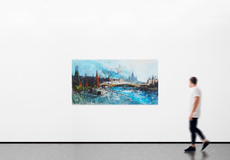 В представленной работе Константин Батынков пишет Кремль и Большой Москворецкий мост. Красный детинец становится для художника соединением летящего вперед времени — прогресса, и некоей сакральной константы — вечным и нерушимым. Незаметные с первого взгляда люди напоминают мушек, витающих в небе. Батынков пишет спокойную Москву-реку, по которой курсируют прогулочные трамвайчики. Благодаря беглому и свободному мазку, формирующему композицию, и нечеткости контуров и форм, полотно замирает на тонкой грани между абстрактной и фигуративной живописью. Работы Константина Батынкова находятся в коллекциях Третьяковской галереи, ММОМА и ГЦСИ. V