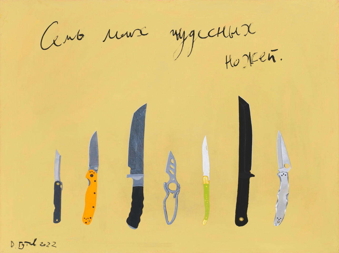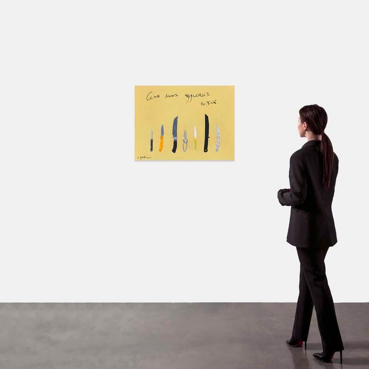 «Эта картина продолжает новую серию, посвященную ножам. Ранее в моем искусстве они никогда не появлялись, и, можно сказать, что с этих работ для меня начинается новый период.