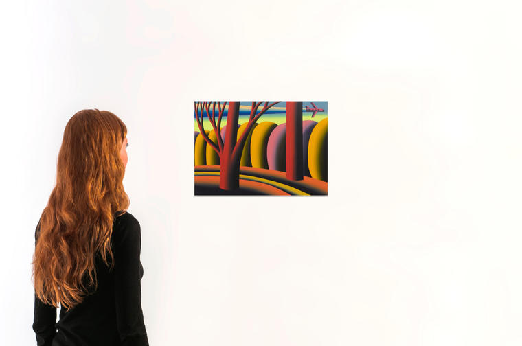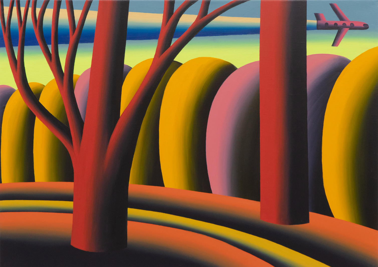 В представленном «Осеннем пейзаже» не найти свободного места, практически отсутствует воздух, нет ни единого живого существа. Ритмичные линии, изображающие лесную тропинку и след от самолета, создают эффект равномерной пульсации, которая также подчеркивает «механистичность» техники исполнения. Это идеальный мир, в котором гладкие формы в равномерном теплом освещении словно сделаны из синтетического материала, а сформированные из них пространства существуют в безвременье как некие условные модели мира.