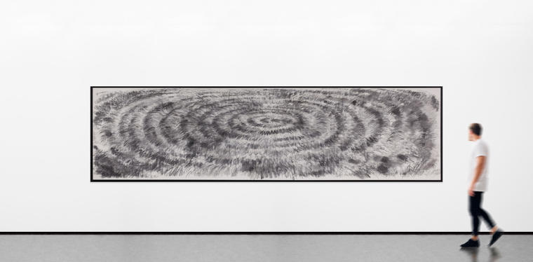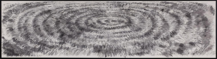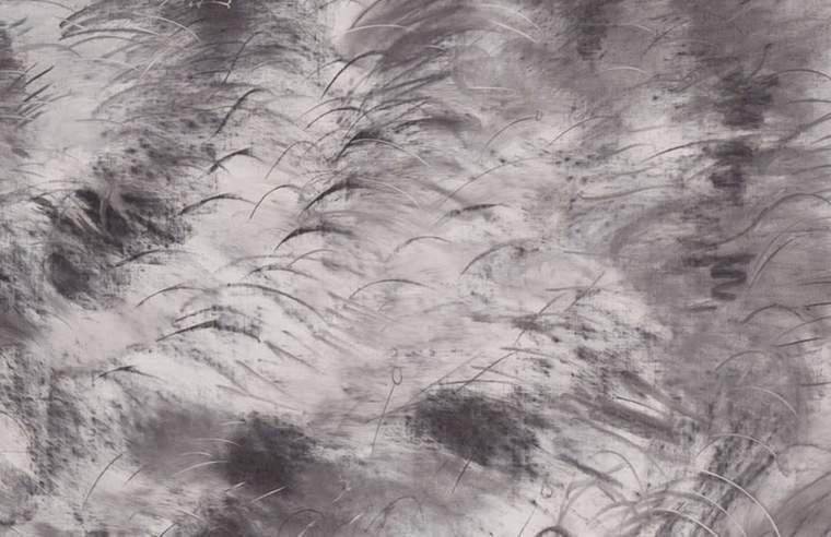 Как это нередко свойственно работам Алексея Каллимы, масштабная композиция произведения «Шерсть» балансирует на грани абстракции и узнаваемого природного мотива. «Это вид сверху на траву, — говорит художник, — На ней следы от вертолета, висящего над землей: он ищет кого-то и раздувает лопастями центробежные структуры травы. Это похоже на шерсть. В этой работе еще нет сангины. В 2000-е я часто рисовал именно в черно-белой гамме». Каллима пишет траву в излюбленной графической технике с применением угля, что дает ему возможность избежать устоявшихся композиционных и колористических решений и всецело сосредоточиться на конструкции и экспрессии авторского жеста. В трактовке художника круги на траве предстают скорее явлением самостоятельным, чем вызванным внешними факторами. С одной стороны, Каллима, будучи увлеченным самой структурой большого бескрайнего поля, словно внимательно анализирует и стремиться зафиксировать, как потоки воздуха оставляют следы на траве. С другой стороны, автор далек от научно-исследовательской холодности: он обрушивает на зрителя стремительный графический «шторм», показывая все разнообразие своего таланта. Как мастер рисунка, Каллима создает свое поле, напоминающее волокна шерсти, многослойным напластованием нанесенных штрихов и спиралей. Палочка угля, растушка или ластик скользят по поверхности в процессе свободной импровизации, развивая разнообразные ритмические темы. Вместе они образуют замысловатую структуру, которая вызывает в памяти эксперименты художников-абстракционистов ХХ века — от Марка Тоби, Брэдли Томлина и Жоржа Матье до Сая Твомбли.