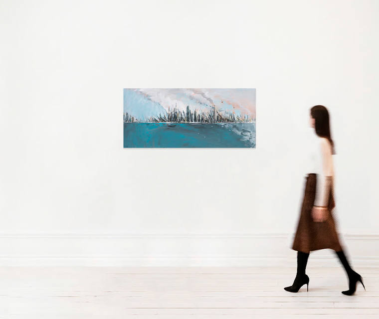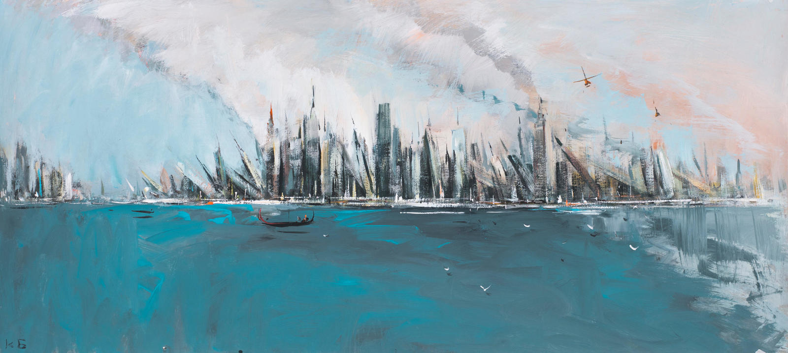 Изменяя привычному изображению горячо любимой Москвы, Константин Батынков пишет Нью-Йорк — город больших надежд. Но как и отечественная столица, «Большое яблоко» представлено автором скорее фантазийно, подобно образу-мечте — тому, что мы представляем, но о чем достоверно не знаем. Картина насыщена пастельными голубыми оттенками, на фоне которых летят самолеты и клубится дым. Движение в сюжете подкрепляется размашистой манерой письма художника, также добавляющей динамизма.