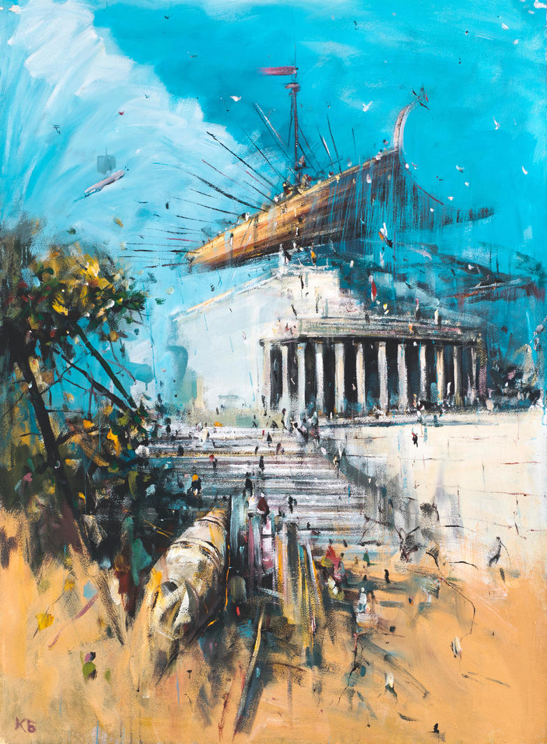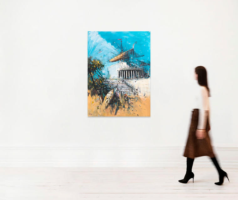 В представленной работе Константин Батынков интерпретирует классическую композицию «Ведуты» — популярного жанра живописи и графики в Венеции XVIII века. Характерной особенностью этого направления было изображение городского пейзажа или памятников архитектуры. Вымышленная постройка отсылает к древнегреческим храмам. Сюжет произведения разворачивается близ древнегреческого святилища Аполлона. Точно определить исторический прототип постройки практически невозможно — Батынков создает скорее собирательный образ античной обители бога. Подножье храма усеяно маленькими фигурками людей, а множество летательных аппаратов рассекает ярко-голубое безоблачное небо. Множество ярких образов создает ощущение праздника, неизвестного зрителям XXI века. Картина наполнена сложными насыщенными оттенками, что выделяет ее среди продолжительного периода черно-белых работ Константина Батынкова.