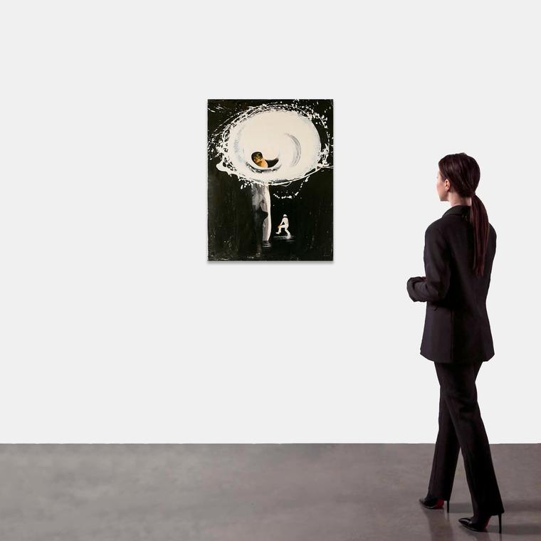 Представленная на торгах работа 1987 года является характерным образцом творчества Петра Беленка. Художник изображает двух мужчин: один словно завис в пространстве в исступлении на фоне бескрайнего космоса, второго же затянул белый водоворот, движение и происхождение которого непредсказуемо ни для зрителя, ни для самого героя. Обилие черного создает ощущение звеняще пустого пространства и подчеркивает ирреальность разворачивающегося сюжета. Художник выводит на поверхность чувство тревоги и страха перед неведомыми человеку силами, но оставляет их метафизическими и абстрактными, тем самым делая свои картины животрепещущими и вневременными.