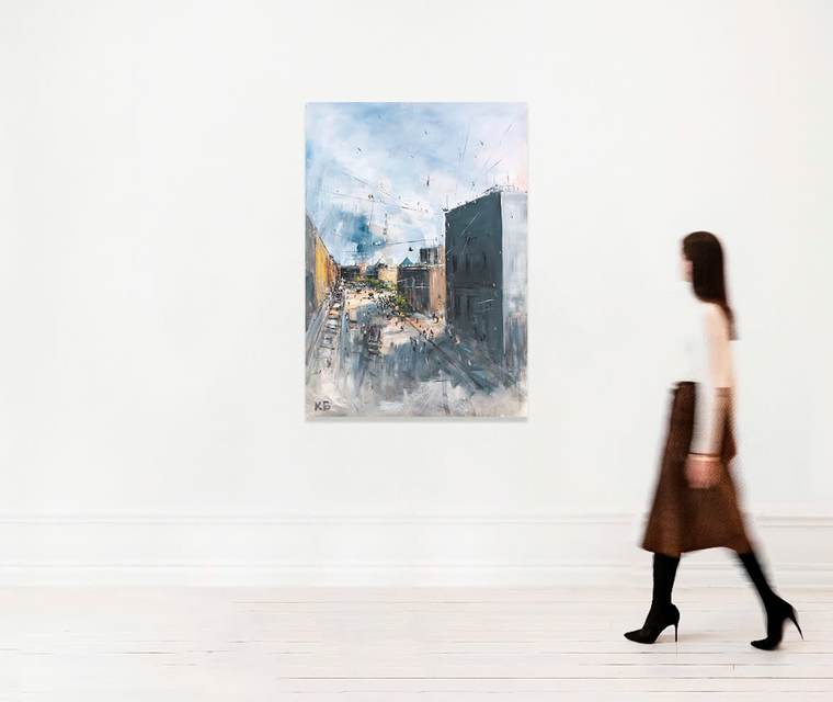 Вообще, я рисую в рамках пейзажа разные состояния моей души. В представленном случае, я захотел сделать что-то позитивное. Поэтому я и остановился на этой теме и написал ее в цвете. По сюжету работы отличаются. Ну, скажем, на одной стройка с красными кранами, они же везде по Москве стоят, есть работа с каруселью, с каналом, канатоходцами, например. Но это детали, не главное. Главное здесь — не пейзаж, а состояние. Пейзаж состояния. Чем я занимаюсь всегда».