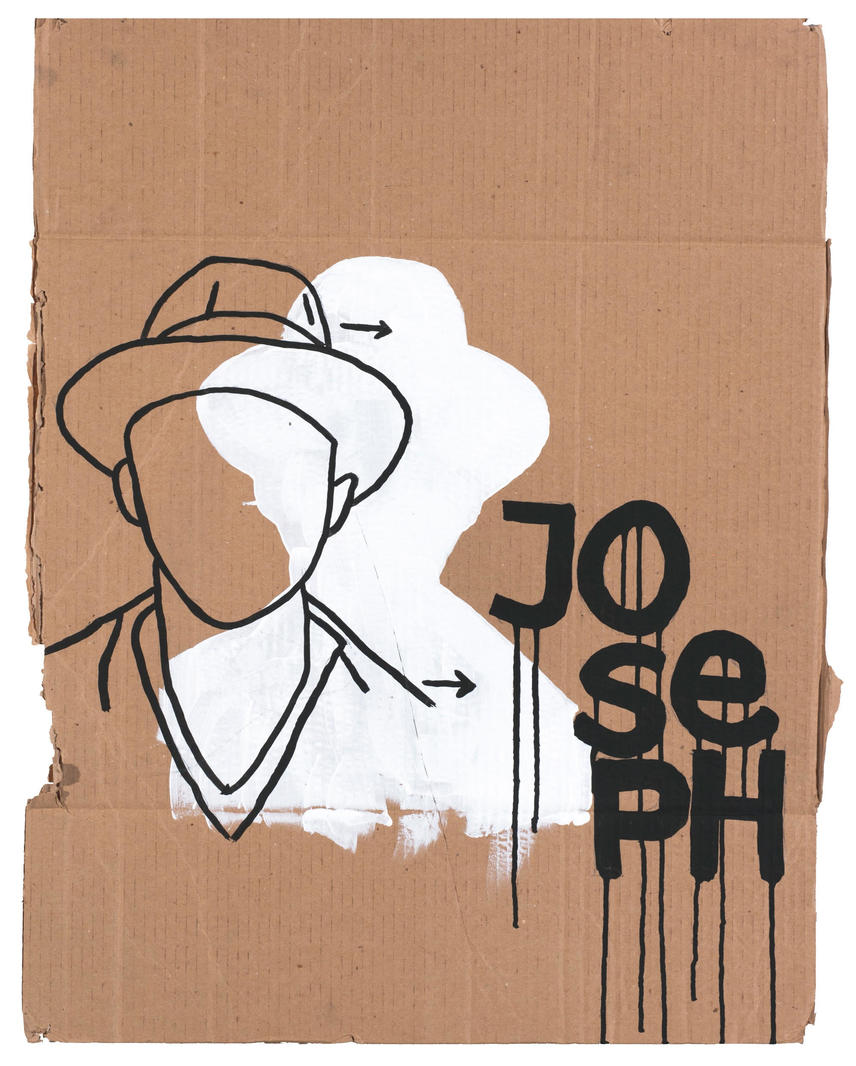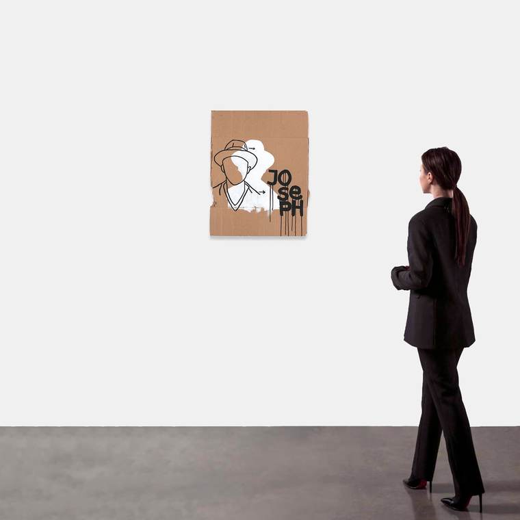 Творчество Валерия Чтака наполнено различными загадками и отсылками, которые предстоит отгадать и понять зрителю. Представленная работа, вероятнее всего, — зашифрованный оммаж немецкому художнику Йозефу Бойсу, черты которого выдает фирменная шляпа и надпись JOSEPH. Примечательно, что в творчестве Бойса доминировали близкие к наскальным росписям рисунки акварелью. Чтак же трансформирует понятие «первобытности» и наносит на оргалитную «скалу» портрет самого Бойса. В работе художник использует фирменные потеки краски и классический дуохром черного и белого.