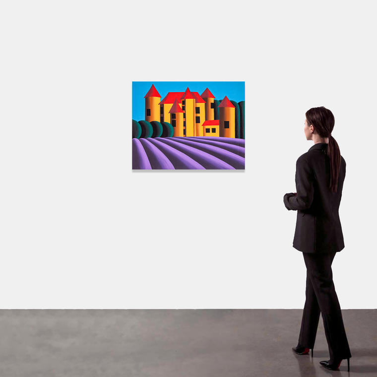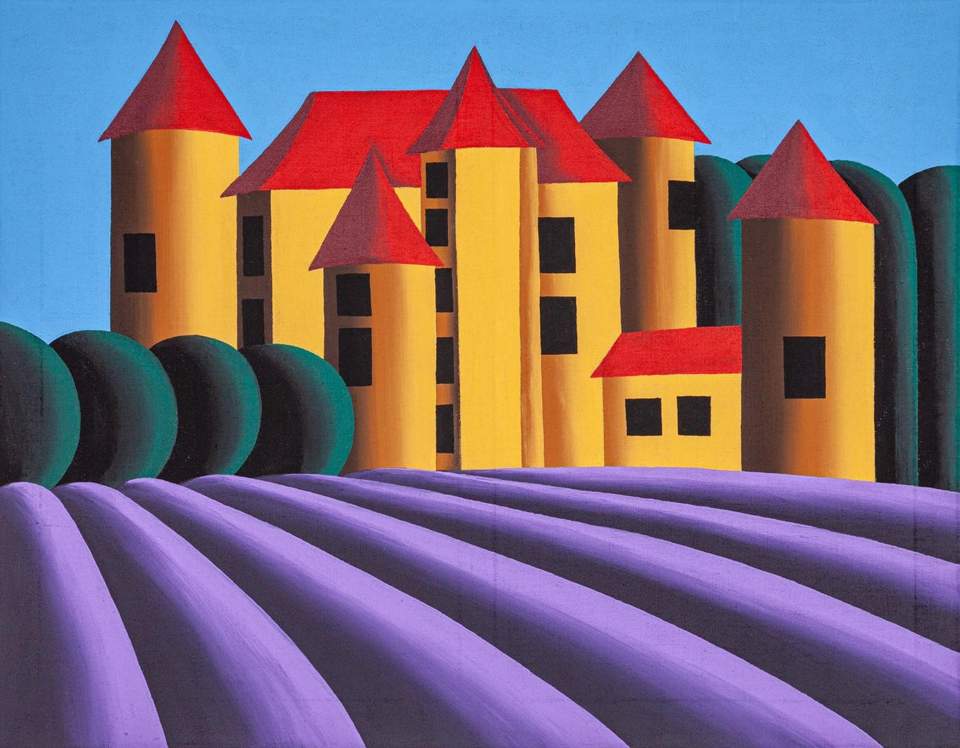 В середине 2000-х годов художник обратился к жанру пейзажа, который в его подчеркнуто декоративной, примитивистской обработке утратил связь с природой как таковой. Примерно в это же время сложилась «изобразительная азбука» Хвостова: шаровидные деревья, стволы-цилиндры, ровные ряды пашен, а также сведенные к простым геометрическим фигурам здания, прорезанные черными прямоугольниками окон. Позднее в произведениях живописца появился самобытный авторский мотив средневекового замка — игрушечного, собранного по частям и застывшего во времени. На картине 2022 года одна из таких фортификационных построек изображена на фоне прованского пейзажа — узнаваемого, но при этом искусственного. Кажется, что гладкие яркие формы в равномерном холодном освещении сделаны из синтетического материала, а сконструированное из них пространство вовсе неподвижно. V
