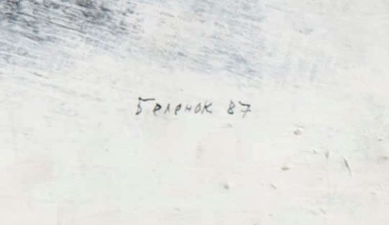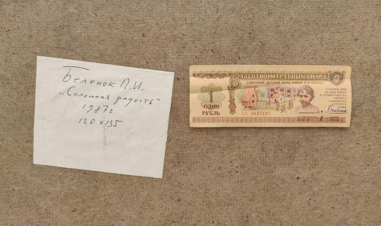 На оборотную сторону работы вклеен благотворительный билет, средства с продаж которого шли в помощь детям-сиротам. Художник часто покупал билеты на деньги, которые приносили редкие продажи произведений, и дарил жене — для нее, как для воспитанницы детского дома, такие вещи имели особое значение. На оборотах работ билеты размещались Беленком «на удачу», представляя собой своеобразное воплощение перформативной практики художника.