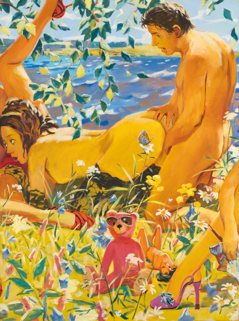 Известный дуэт пересмешников соцреализма Александра Виноградова и Владимира Дубосарского, хотя и родился в девяностые, но набрал мощности и воссиял как раз к миллениуму. Искрило здесь соединение двух совершенно несочетаемых, но могучих и страстных потоков коллективных желаний общества, уже десятилетие как выходящего из советской системы: достичь современного уровня потребления при сохранении командно-административного распределения. Все хотели вместиться в соцреализм, а он, как известно, не резиновый — возрастало напряжение, нервозность, в воздухе веяло нестыковками.