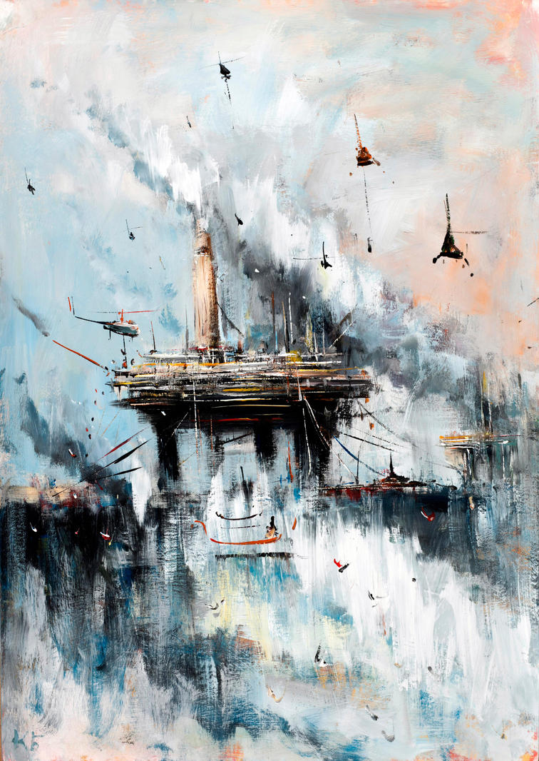 Произведения Константина Батынкова балансируют на грани между абстракцией и фигуративной живописью. Различные авианосцы, крейсера и фрегаты — излюбленные мотивы в творчестве художника. На картине 2011 года «Шлейф» он изображает надстройку корабля, часть которого находится под водой. Благодаря непропорциональному соотношению природного и механического создается впечатление, что грозная стихия полностью подчиняет себе гигантское судно. Композиция приходит в движение благодаря ритмическому чередованию темных и светлых плоскостей, а также пульсации экспрессивных мазков. Примечательно, что они объединяют работу Батынкова с поисками футуристов, провозгласивших динамику одним из важнейших художественных принципов. Произведения Батынкова находятся в коллекциях Третьяковской галереи, ММОМА и ГЦСИ. V