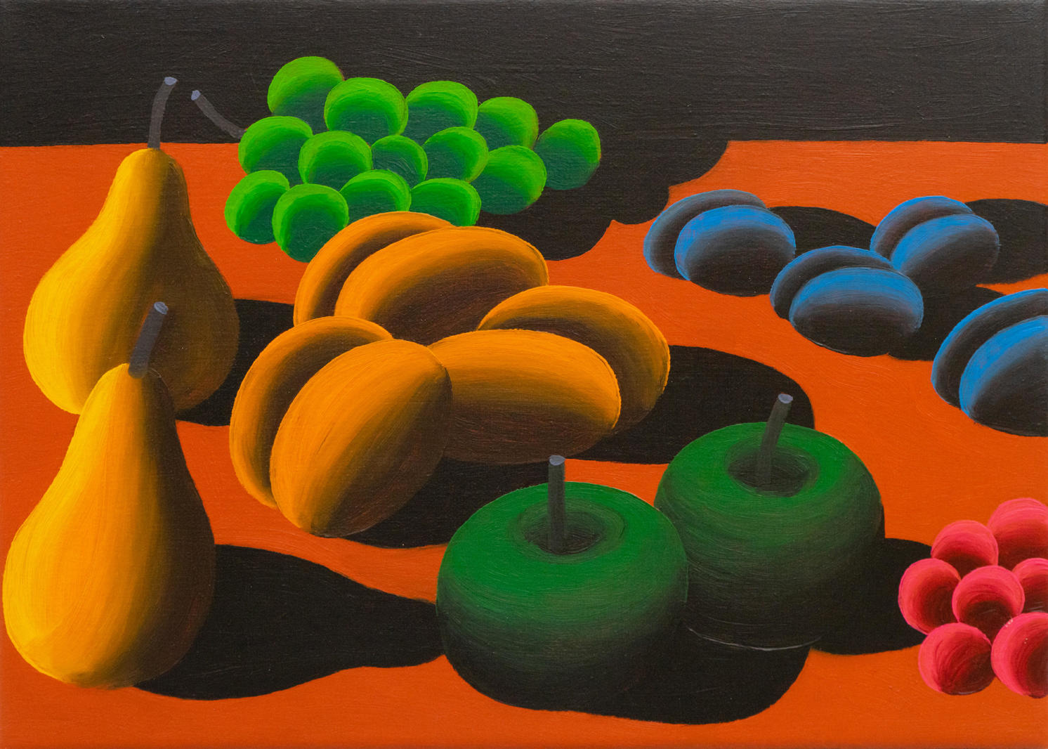 Работа Хвостова «Натюрморт» создана на основе простейших геометрических форм. Натюрморт для художника предстает традиционным жанром, в котором можно проводить формальные эксперименты и оттачивать мастерство. В конце концов, это именно та натура, которая способна находится достаточное количество времени в неподвижности. Кроме того, для художника изображение пищи — символ достатка и сытой жизни. Картину 2021 года он пишет в характерной для него манере, однако здесь автор фокусирует свое внимание на контрасте предметов и фона с черными тенями.