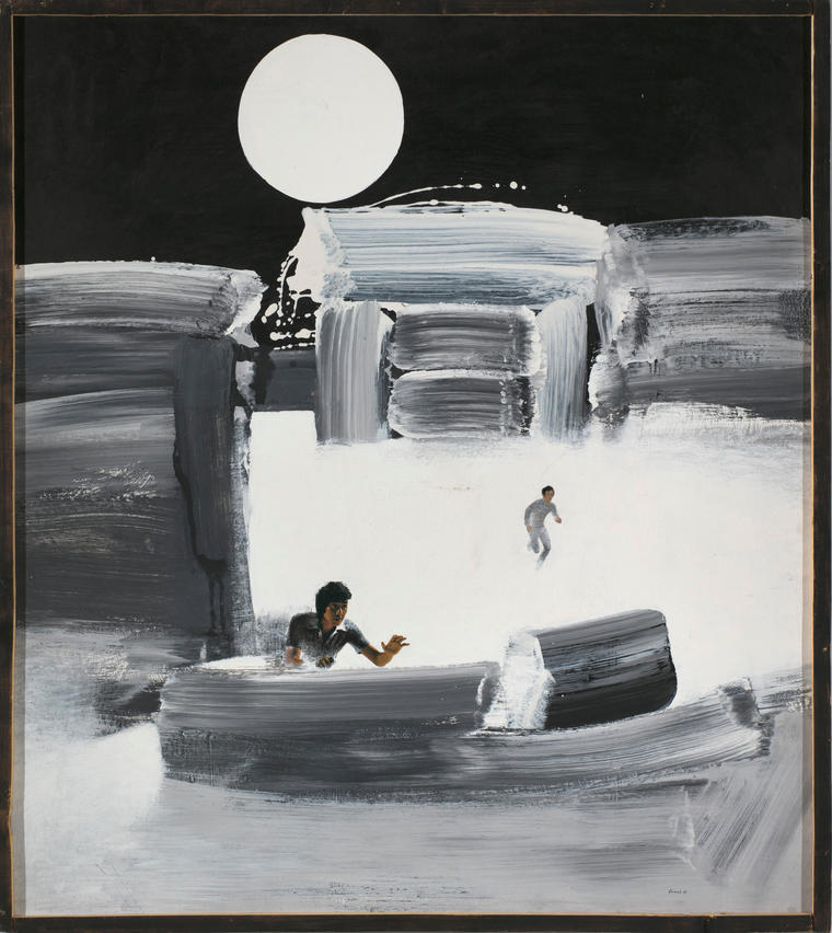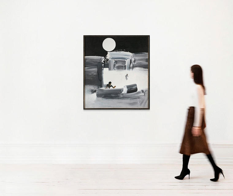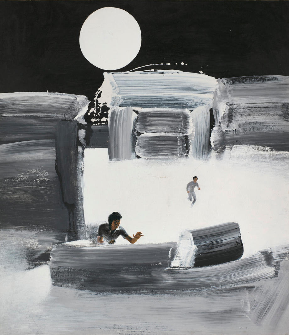 В представленной работе 1987 года «В лодке» люди обращены в бегство, в попытке спастись от надвигающегося «всемирного» потопа. Беленок помещает одну маленькую фигурку на передний план, обрезая ее чуть ниже пояса, — это «счастливчик», добравшийся до чего-то вроде лодки, форма которой образована беглым широким мазком кисти. Натуралистичность фотографического образа фигуры резко контрастирует с эфемерностью спасительного судна, что создает ощущение безысходности и тщетности усилий ближайшего к зрителю персонажа. Фигура бегущего человека на втором плане дематериализуется, поглощаемая густыми белыми водами, уже заполонившими окружающее просранство. Ровный, геометрически идеальный диск луны в непроницаемо черном небе становится немым свидетелем происходящей катастрофы.