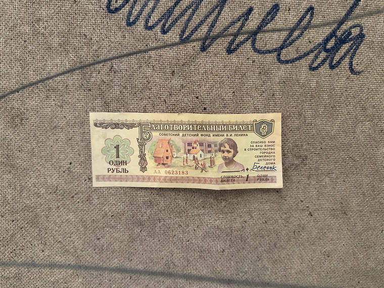 На оборотную сторону работы вклеен благотворительный билет, средства с продаж которого шли в помощь детям-сиротам. Художник часто покупал билеты на деньги, которые приносили редкие продажи произведений, и дарил жене — для нее, как для воспитанницы детского дома, такие вещи имели особое значение. На оборотах работ билеты размещались Беленком «на удачу», представляя собой своеобразное воплощение перформативной практики художника.