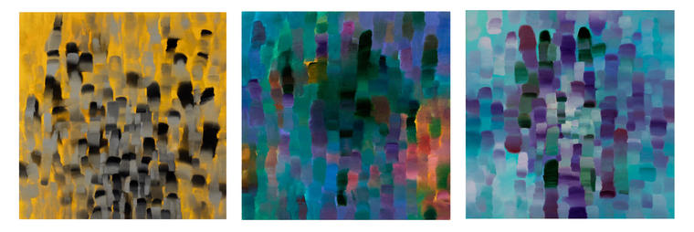 Три отдельных работы – «Утро (Привет Марку Ротко)», «Солнце садится за гору» и «Солнце садится за гору 2» – честно передают то, что автор видел на исподе закрытых век как на экране. А триптих «Попурри» основан не на конкретных визуальных впечатлениях. Он, скорее, образ остаточного зрения – с его мерцающими, перетекающими друг в друга цветами, с его особым пространством и колоритом, что разыграны как бы под сурдинку, с его «реалистическим абстракционизмом».