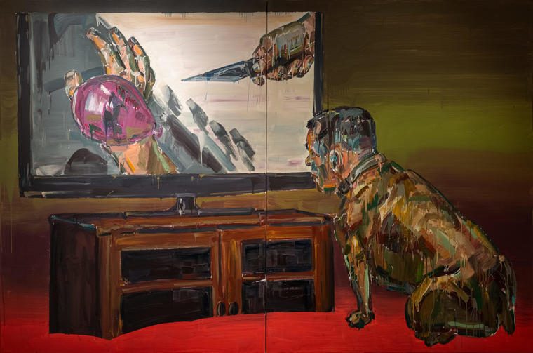 Быть может, именно поэтому на выставке центральное место отведено произведениям с «плавающим», нестабильным образом, как, например, в работе Семена Файбисовича «Северные огни из цикла “На остановке”» 2007 года. Созданная в момент возвращения автора к живописи после перерыва в девяностых, она знаменует собой новую реальность, находящуюся теперь на стыке случайности и редимейда. Надо отметить, что произошедшая за эти годы смена аналоговой фотографии на цифровую была воспринята Файбисовичем с изрядной долей скепсиса: новые технологии принесли стандартизацию и огрубление образа, что художник и показывал в живописи 2010-х годов. Два лица — девушки с постера и девушки в капюшоне — предстают как разные ракурсы одного и того же персонажа, меняющиеся в зависимости от угла зрения, как это было в первых стерео-открытках в доцифровую эпоху. Простой эффект аверса-реверса, фасада и изнанки рождает ощущение двойного дна, неподлинности, подлога.