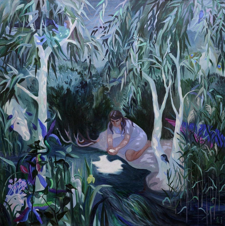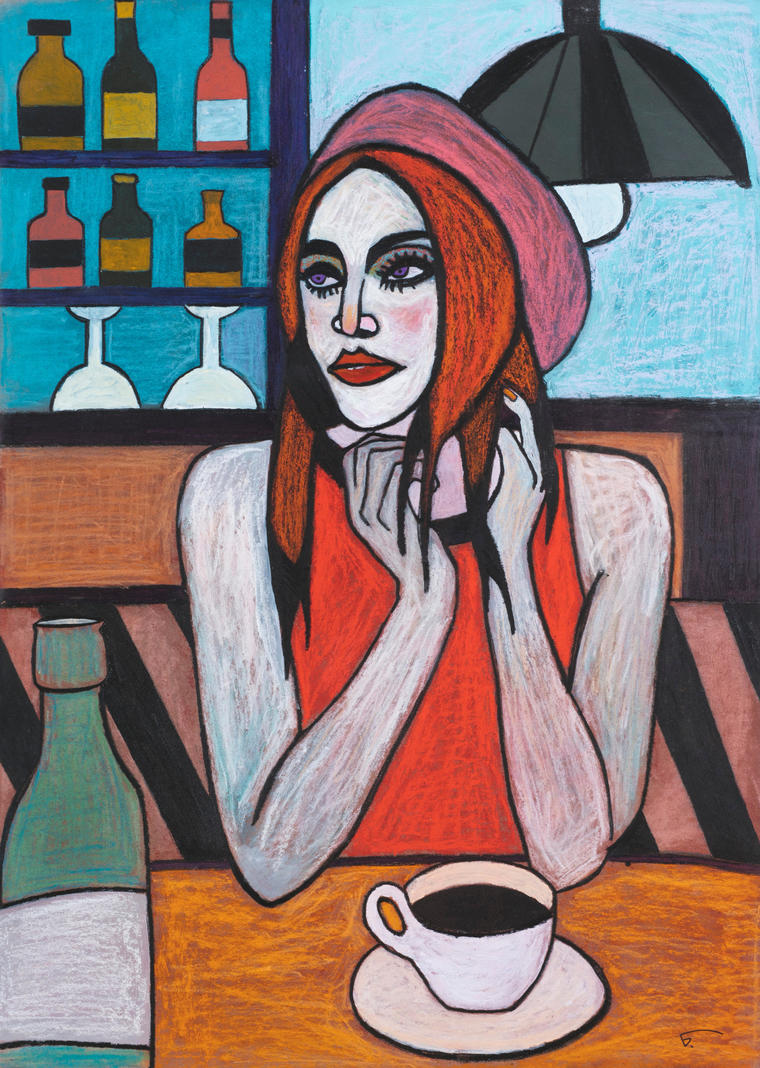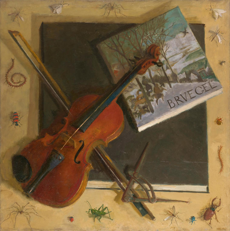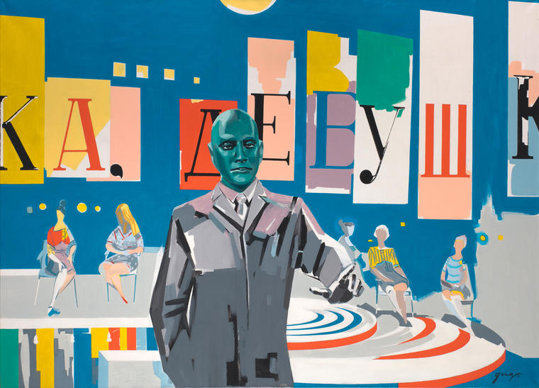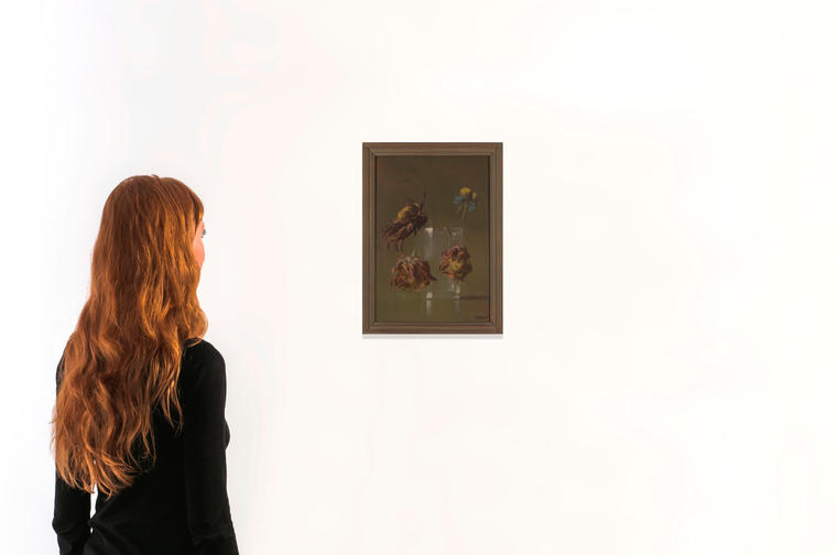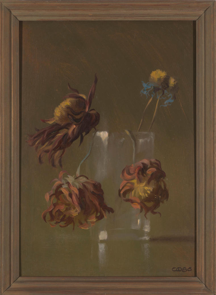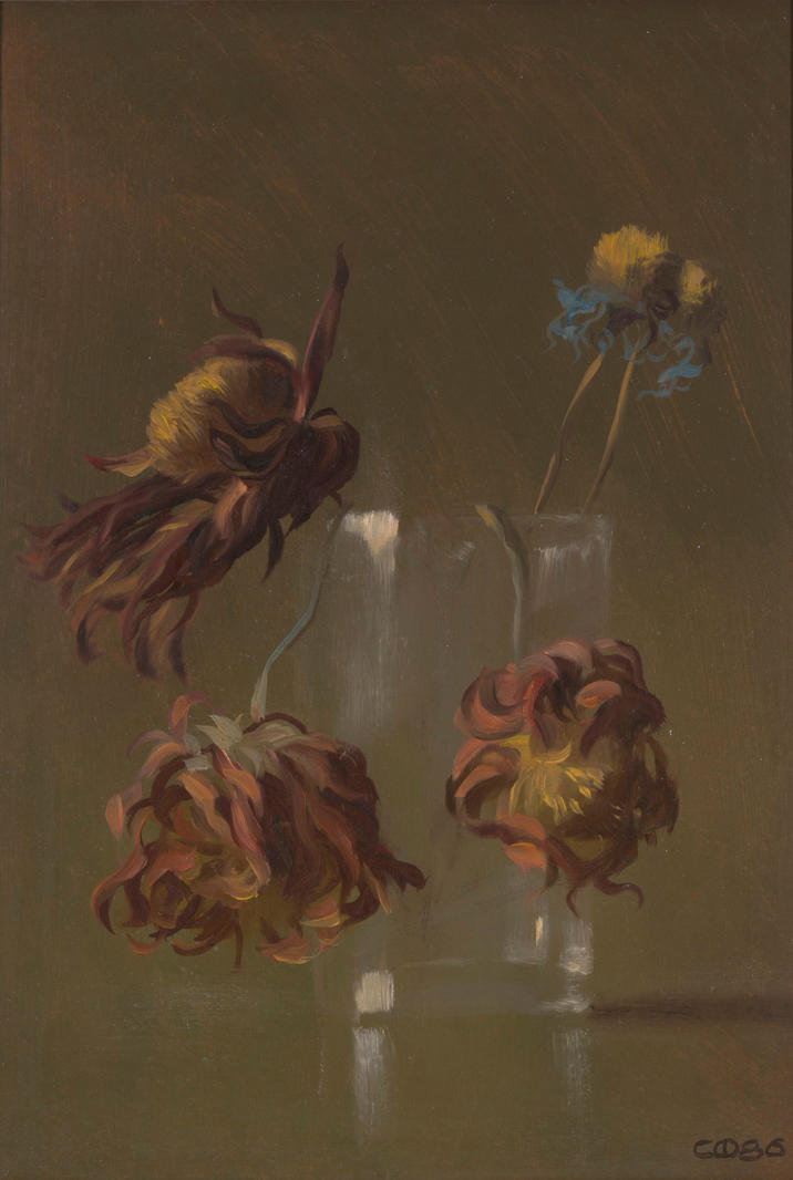 На представленном холсте натюрморт становится пространством игры теней и полутонов: стеклянная ваза с букетом астр стоит на монохромной поверхности, в которую вторгаются тонкие блики света. Множество желто-коричневых оттенков, использованных здесь, придают пространству объем, а лепестки написаны так, что создается ощущение их движения от легкого дуновения ветра. Семен Файбисович — мастер тончайших нюансов визуального: в изображении цветов и прозрачной вазы он словно ловит внутреннее свечение, а на поверхности — сложный рисунок теней и отражений. Натюрморт 1986 года сконцентрировал в себе те эксперименты художника, которые позднее приведут его к творческим открытиям конца 1980-х, — работа с наслоениями и бликами, а также особая тонкая передача света.