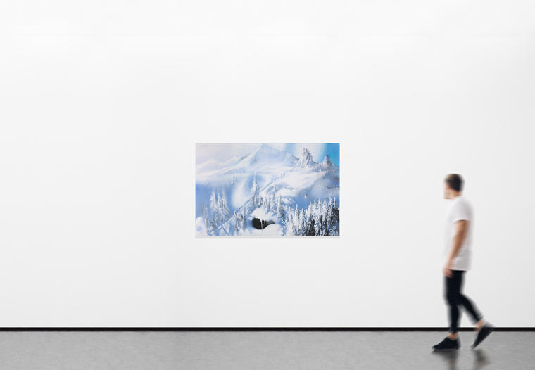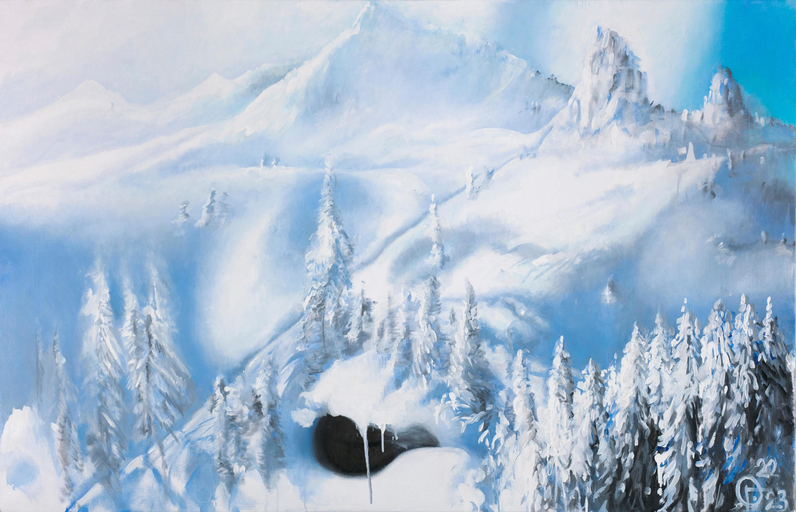 В представленной на торгах работе художница изображает зимний пейзаж. Выполненные в белых и нежно-голубых оттенках заснеженные горные вершины практически сливаются с лазурным ясным небом. Многочисленные ели, иголочки которых припорошены снегом, становятся едва различимыми элементами склона. Художница работает маслом на холсте, но легкость и быстрота наложения мазков сопоставима с техникой акварели. Это создает эффект прозрачной размытости, передающий легкий туман, обволакивающий заснеженный горный склон. Композиционным центром работы становится темная бездонная пещера, которая благодаря использованию плотного черного оттенка вступает в контраст с практически белоснежным зимним пейзажем.